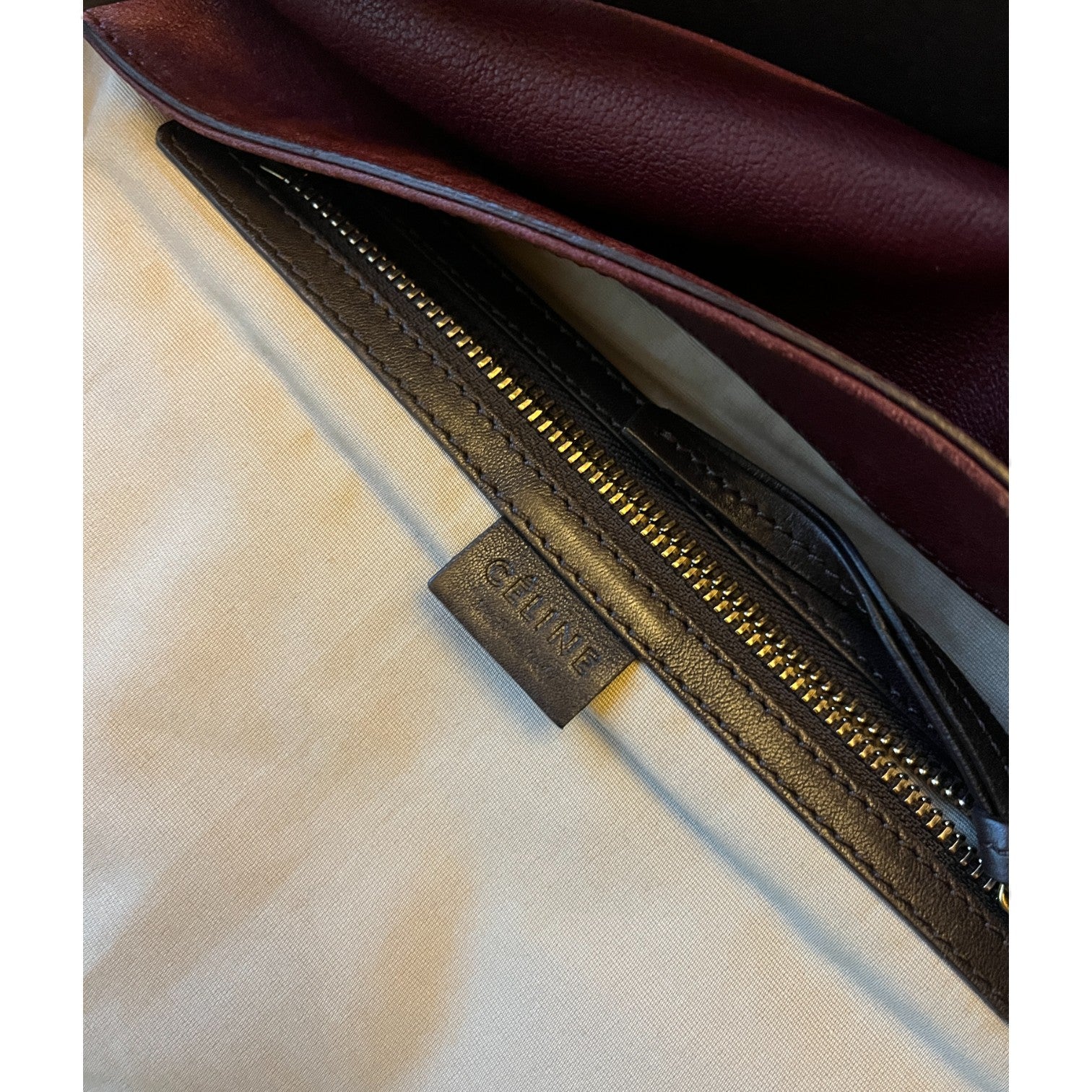 Céline burgundy deer-leather flap shoulder bag with snap closure.. Comes with two straps, including a removable shearling-detailed handle. Canvas lining & small interior pockets