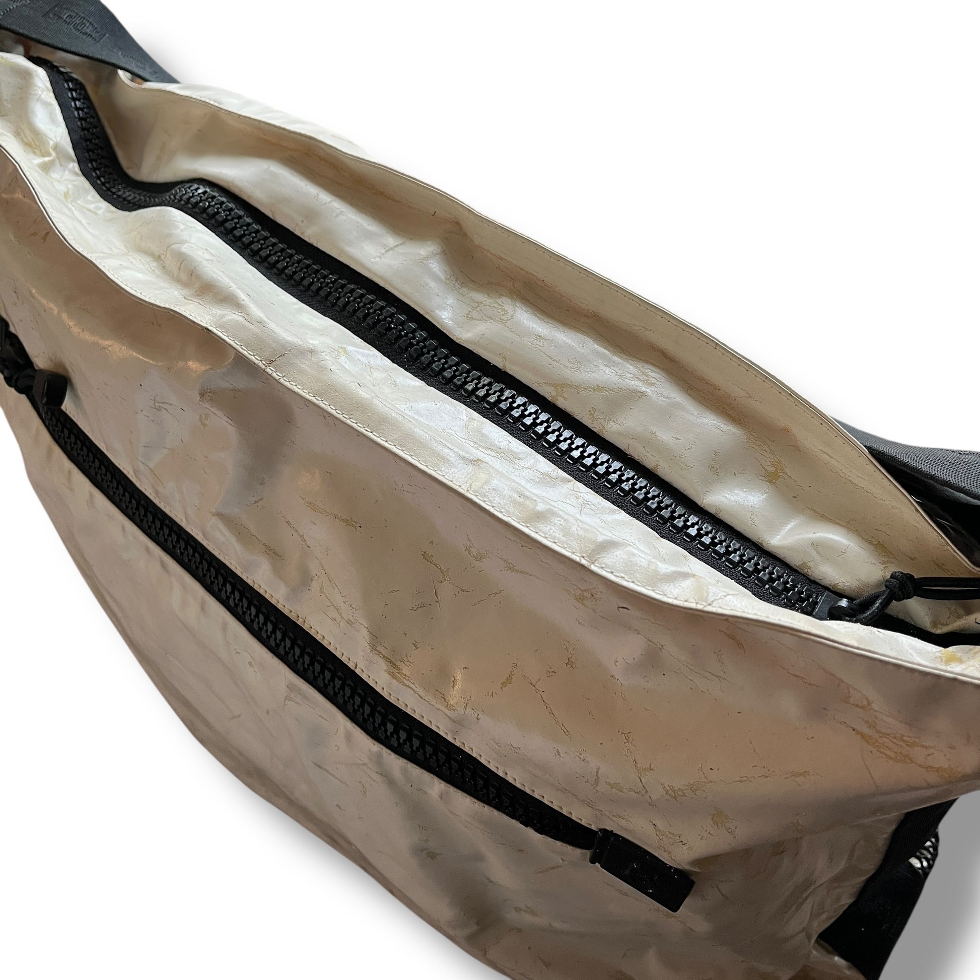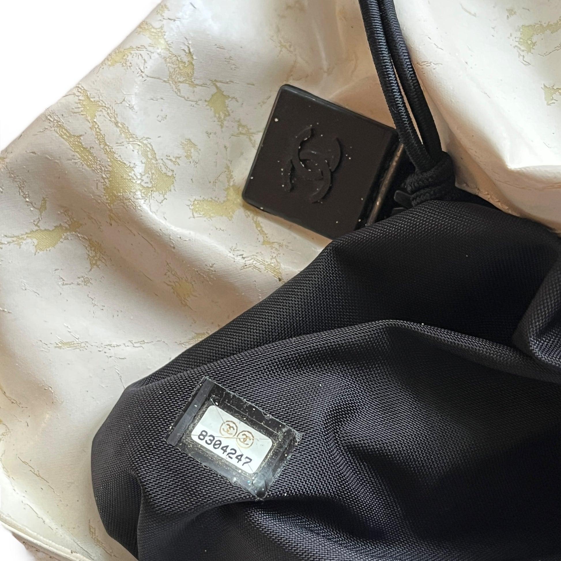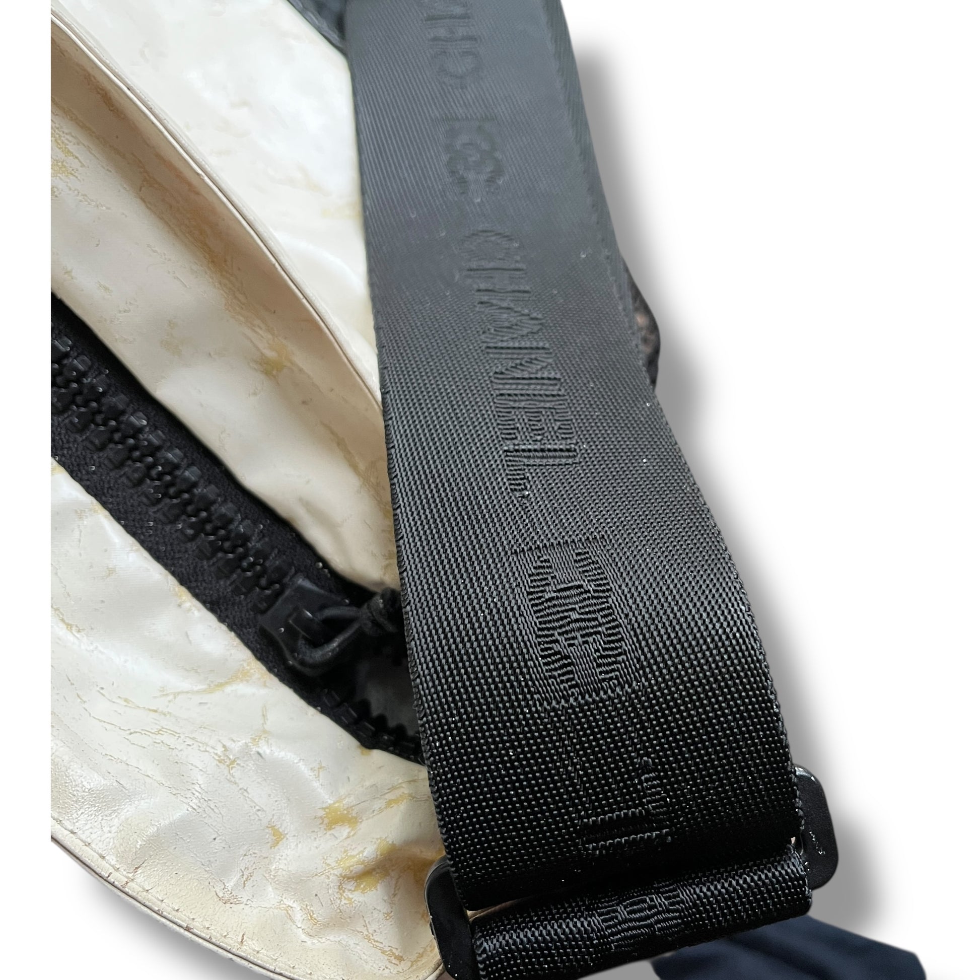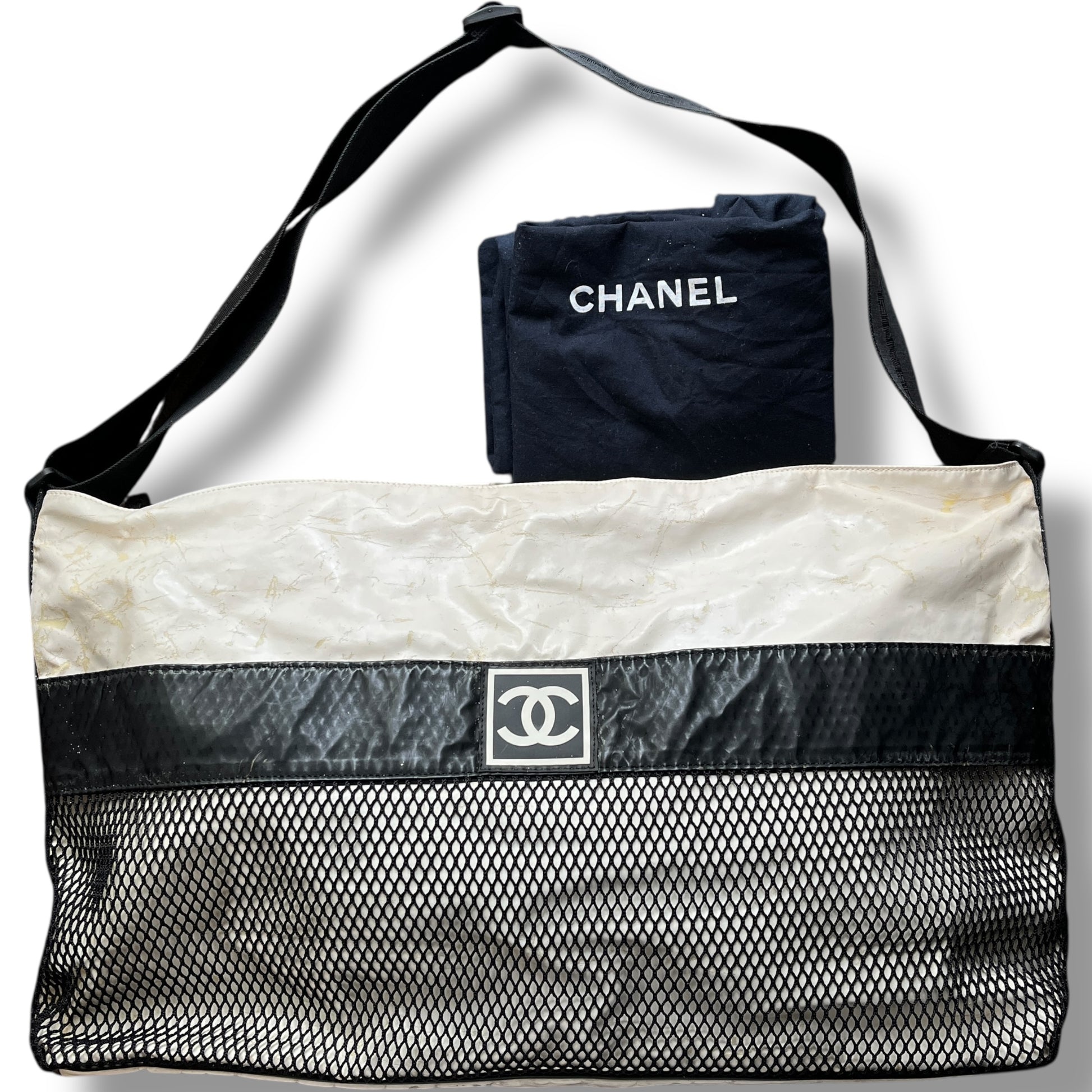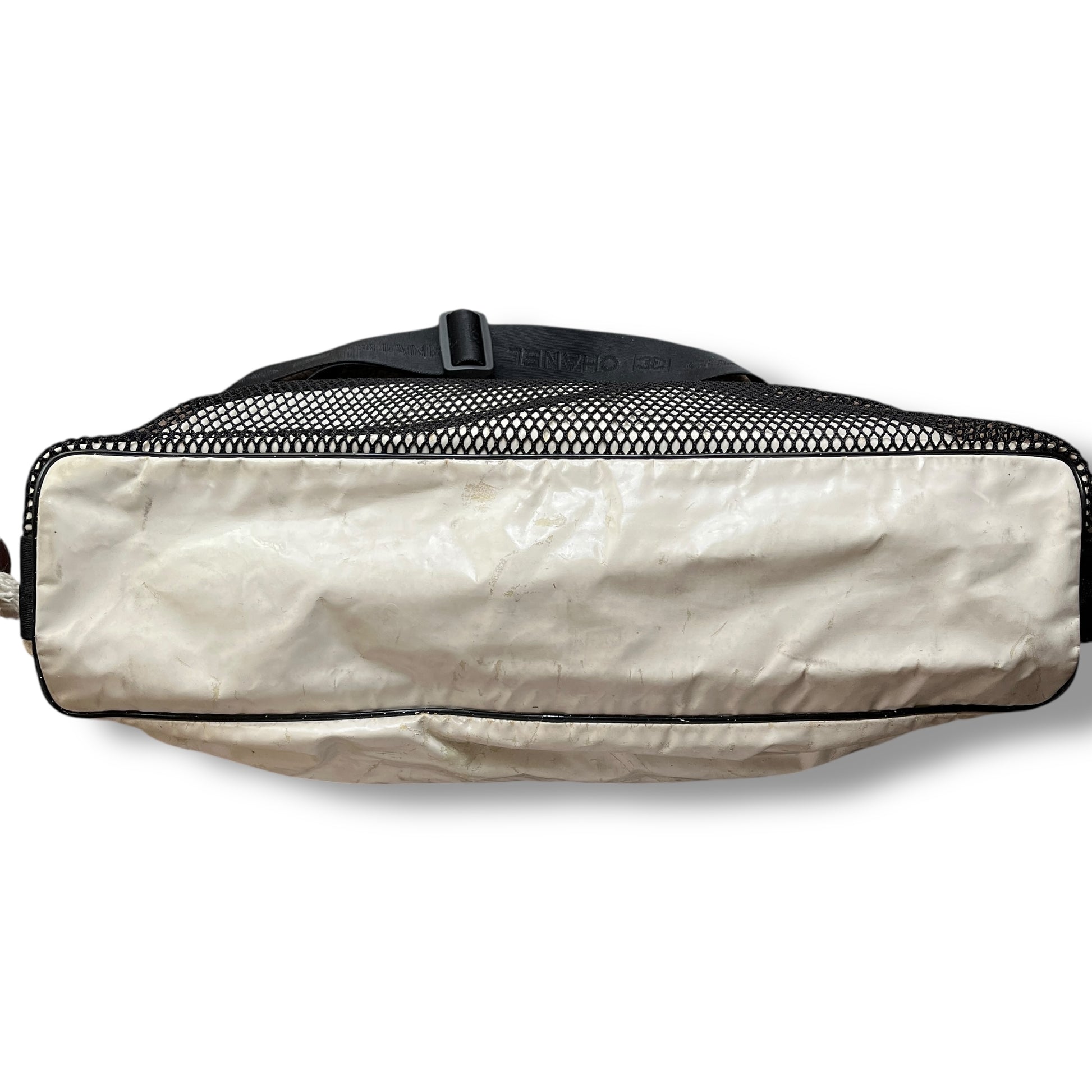 A rare find, crafted in cream nylon with a black vinyl trim, it features a functional zip-top closure, an oversized mesh front pocket, and a bold CC logo plaque at the center. The adjustable logo strap allows for both shoulder and crossbody styling.