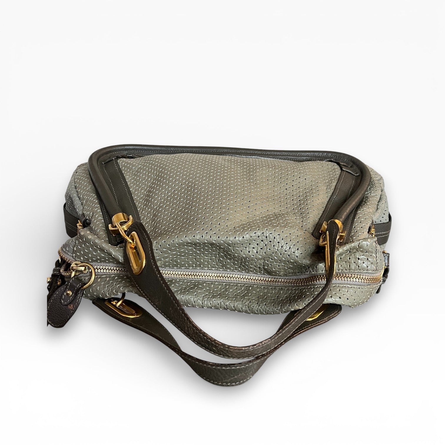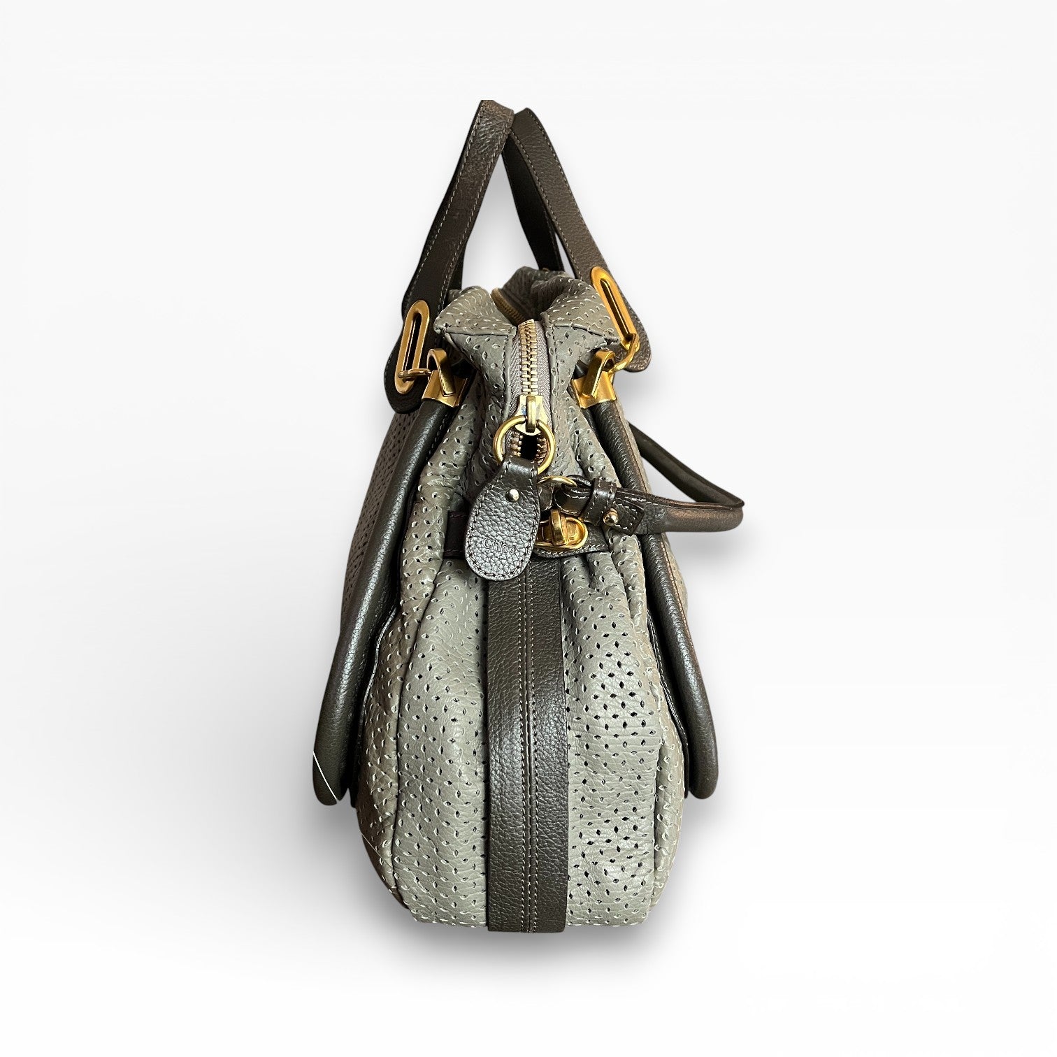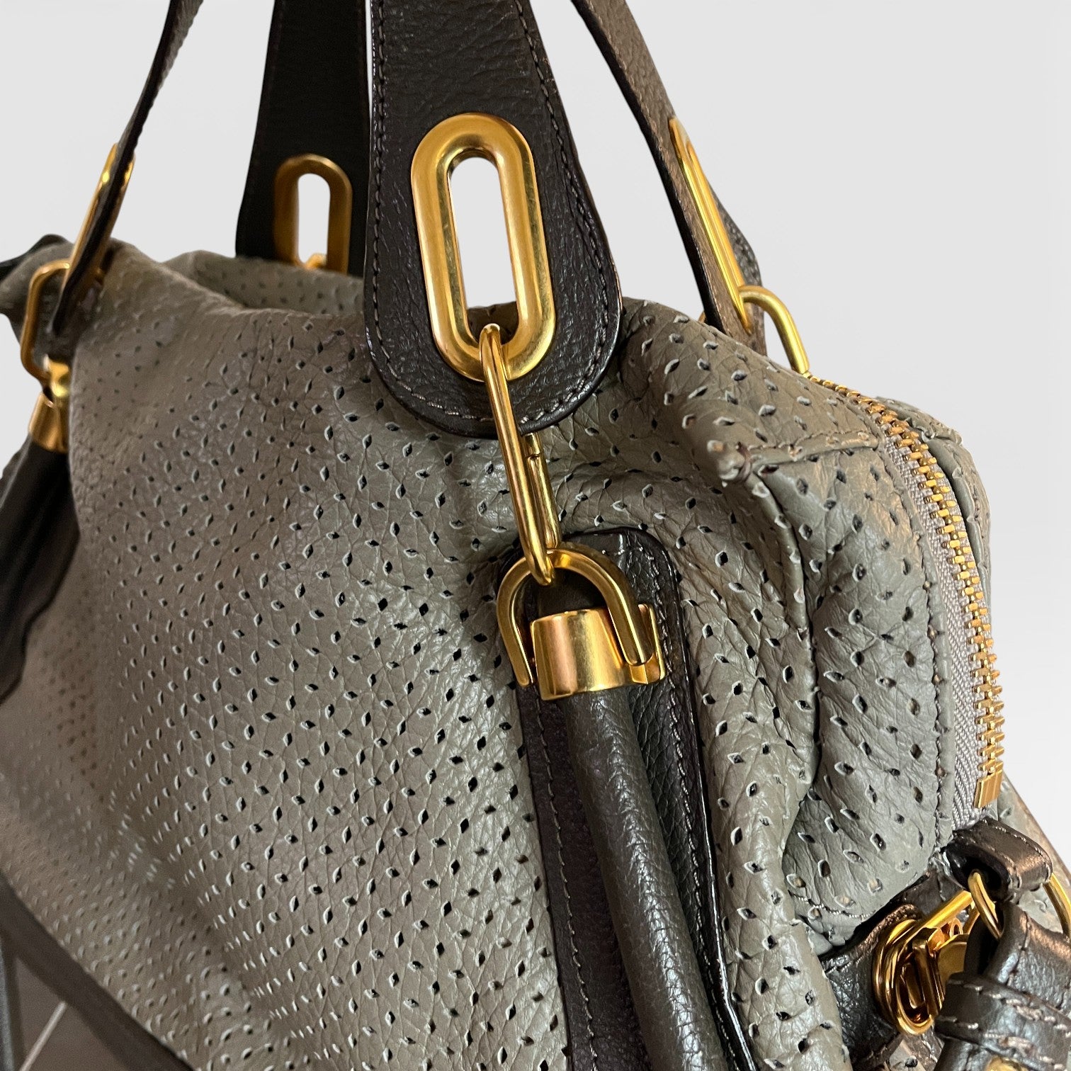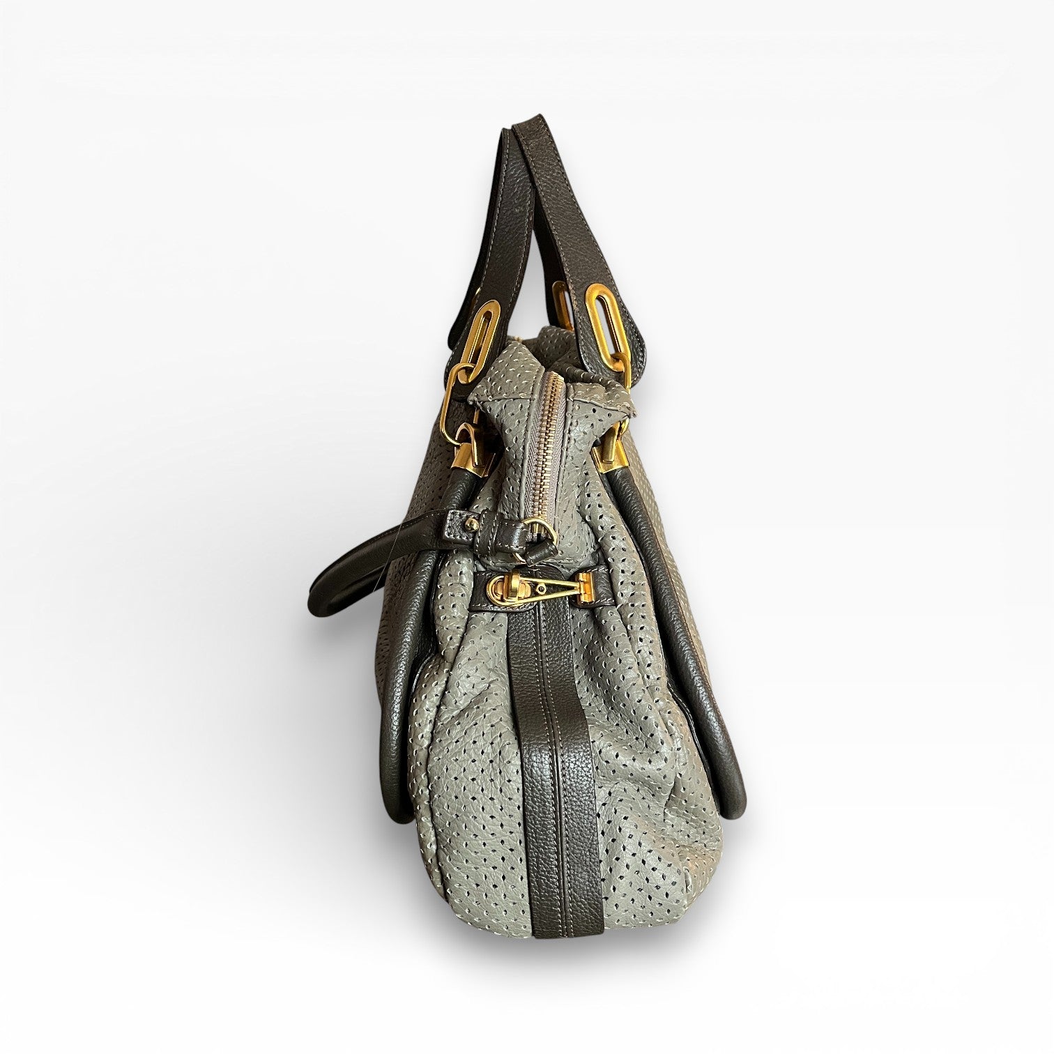 Chloé Paraty handbag in a rare grey perforated leather with dark leather trim and gold-tone hardware. Features top handles and a detachable shoulder strap. Classic structured shape with zip closure. Great everyday designer bag.