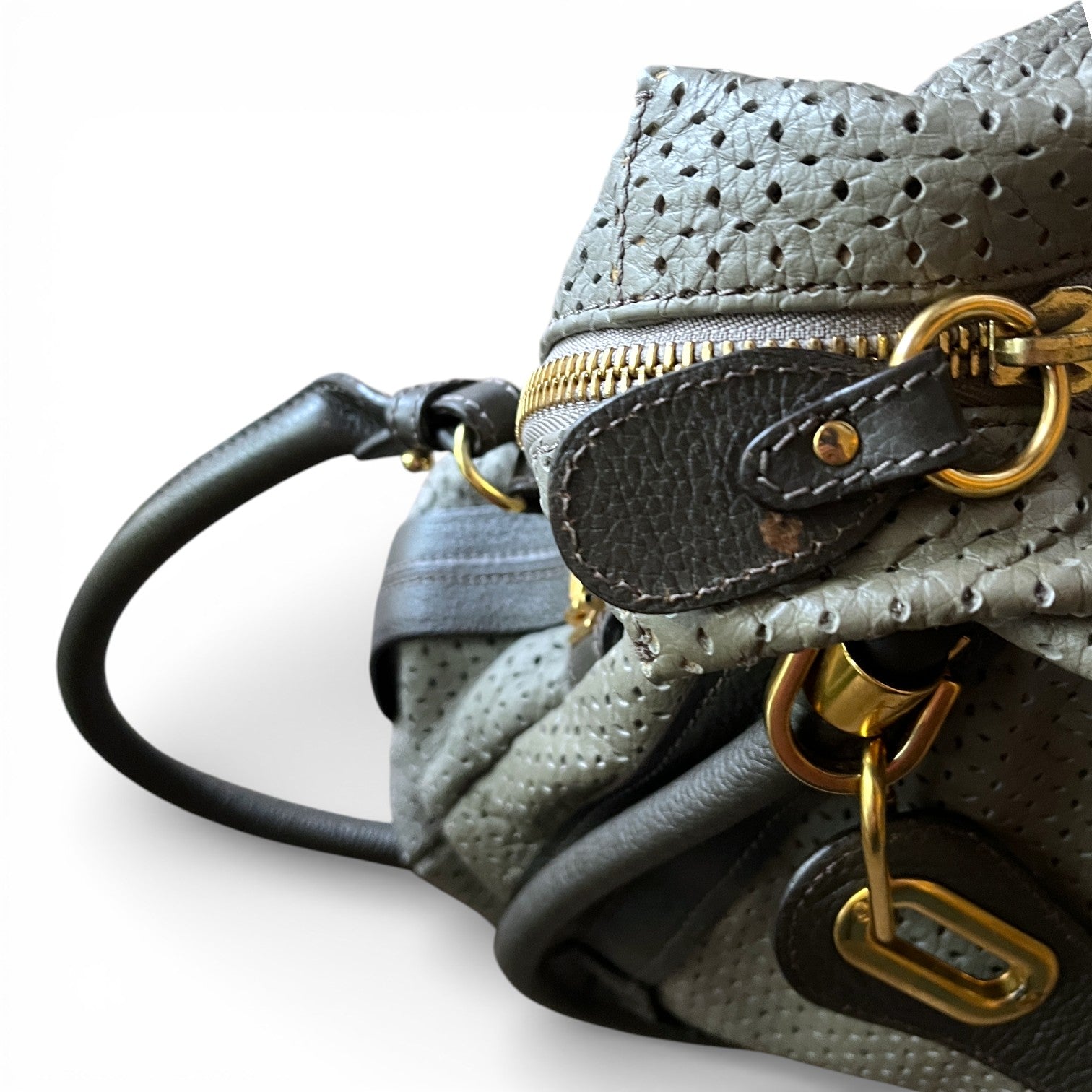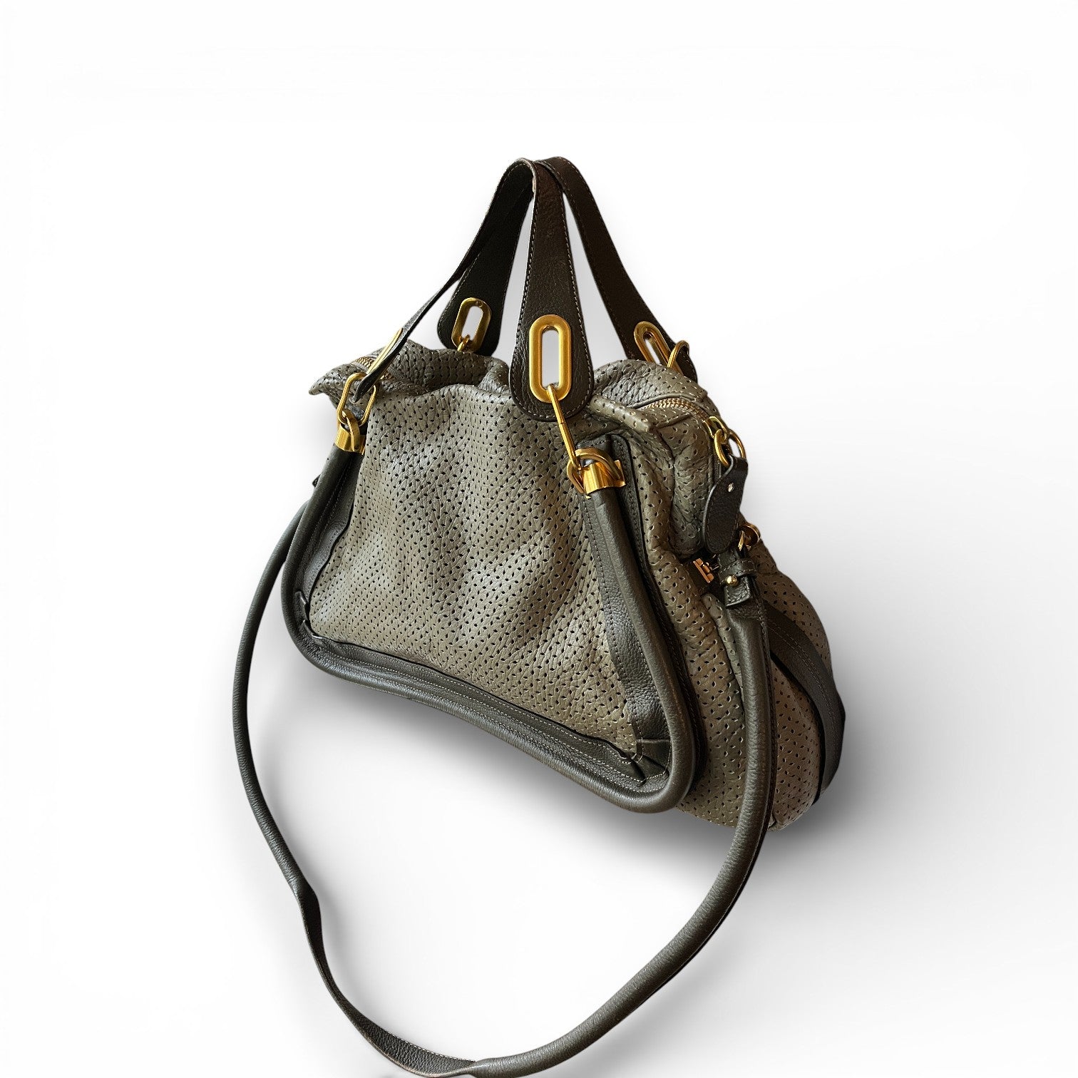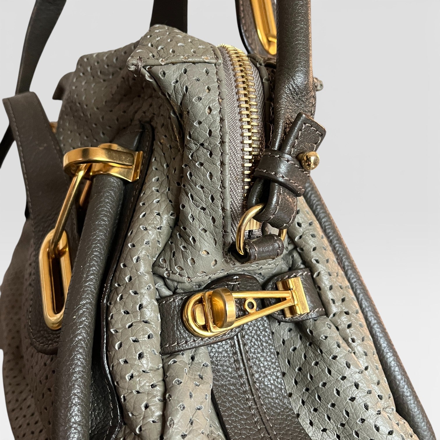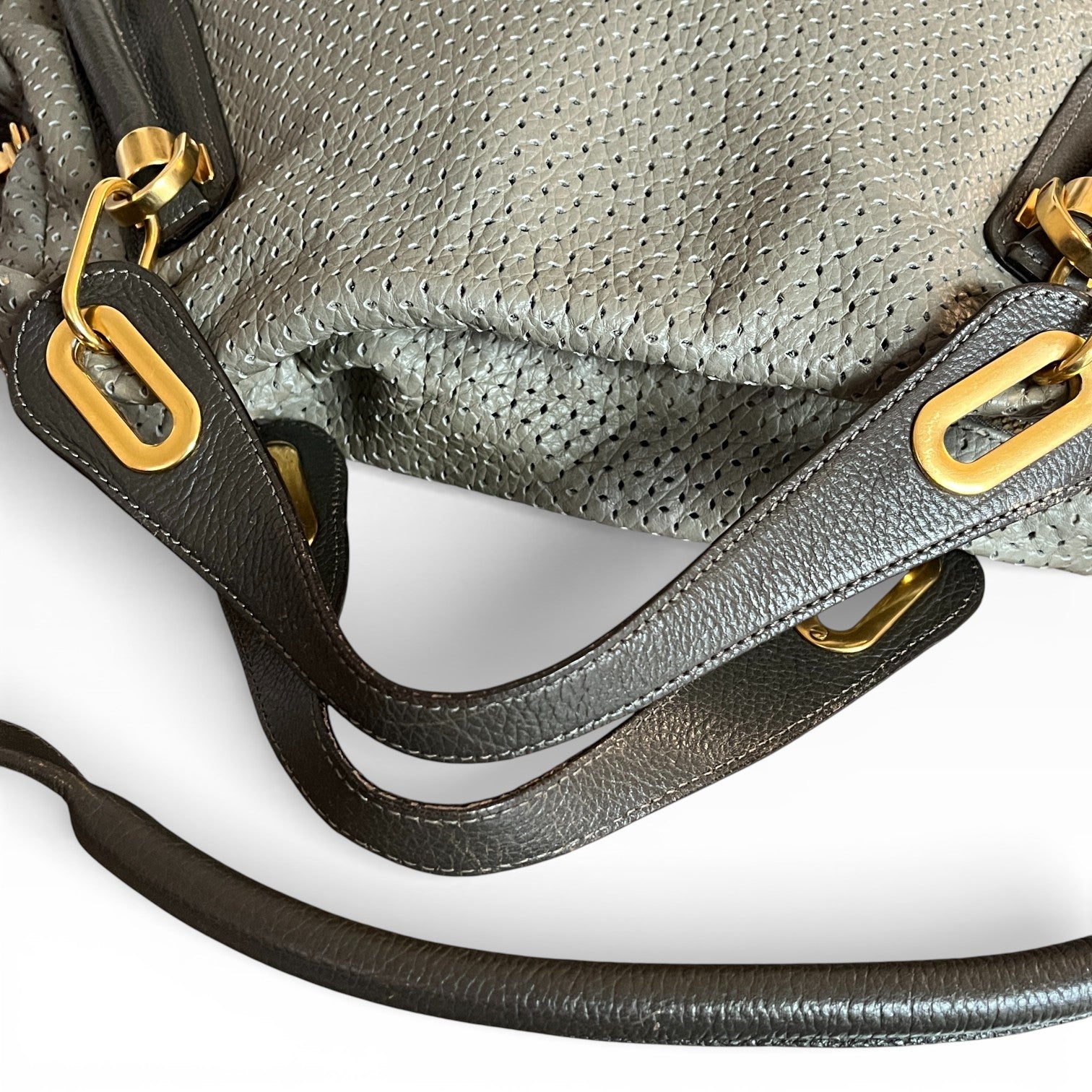 Chloé Paraty handbag in a rare grey perforated leather with dark leather trim and gold-tone hardware. Features top handles and a detachable shoulder strap. Classic structured shape with zip closure. Great everyday designer bag.