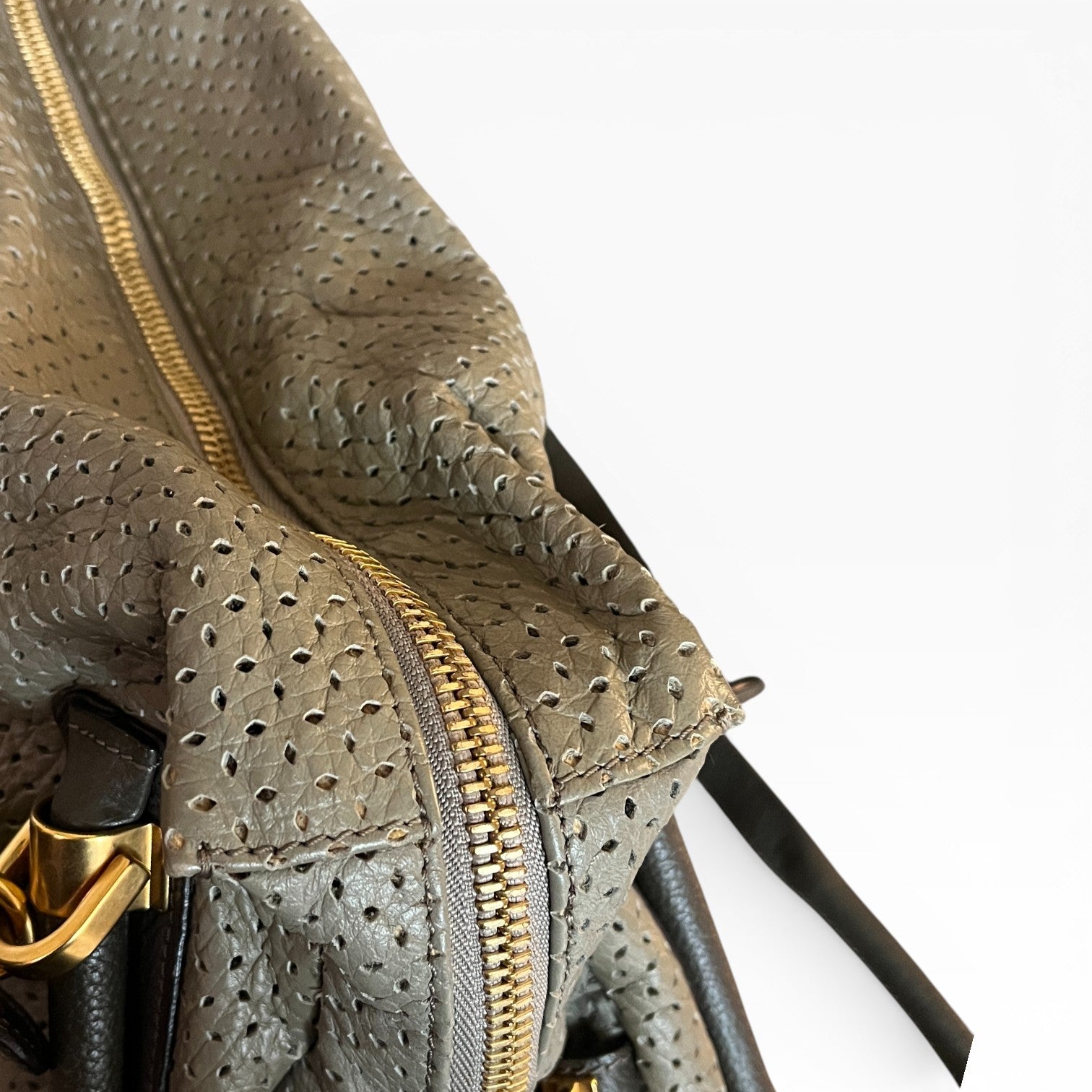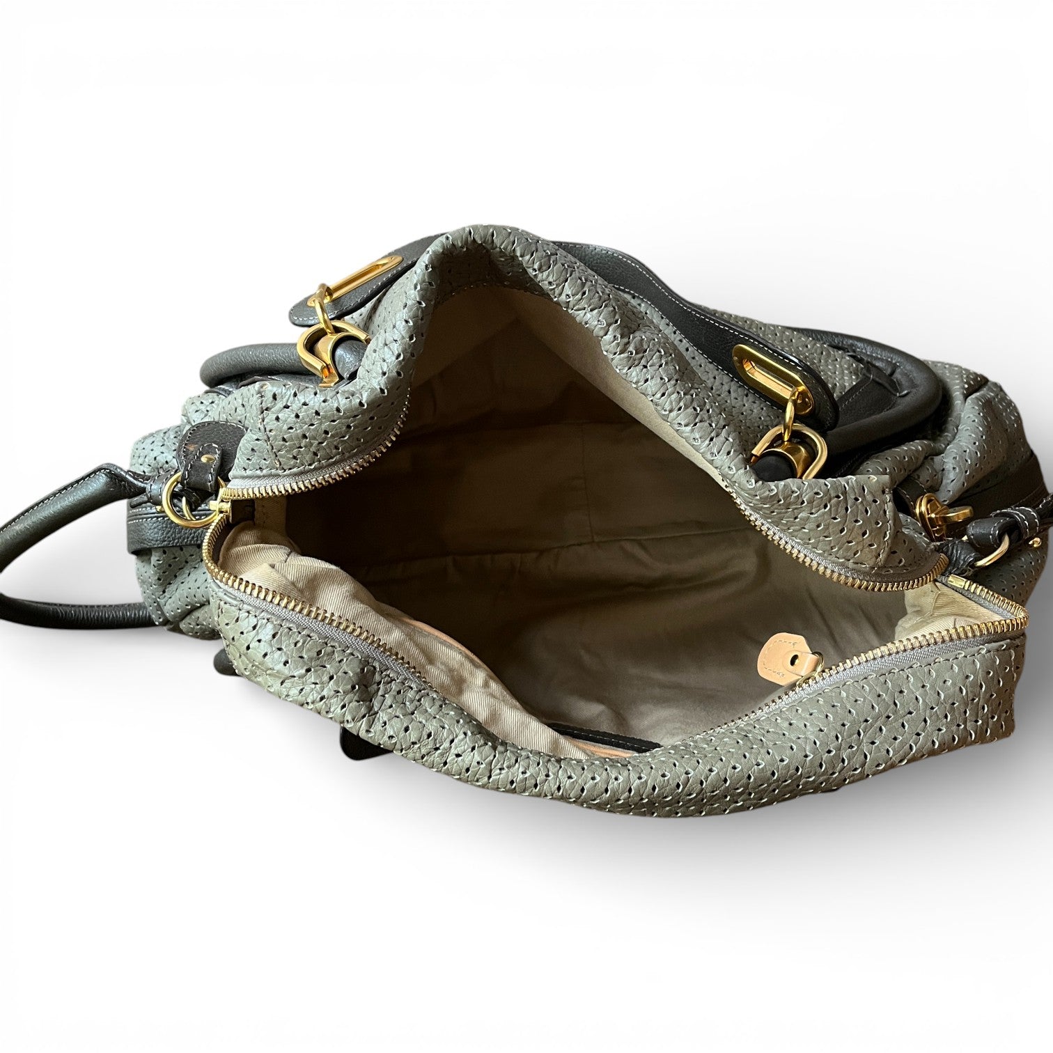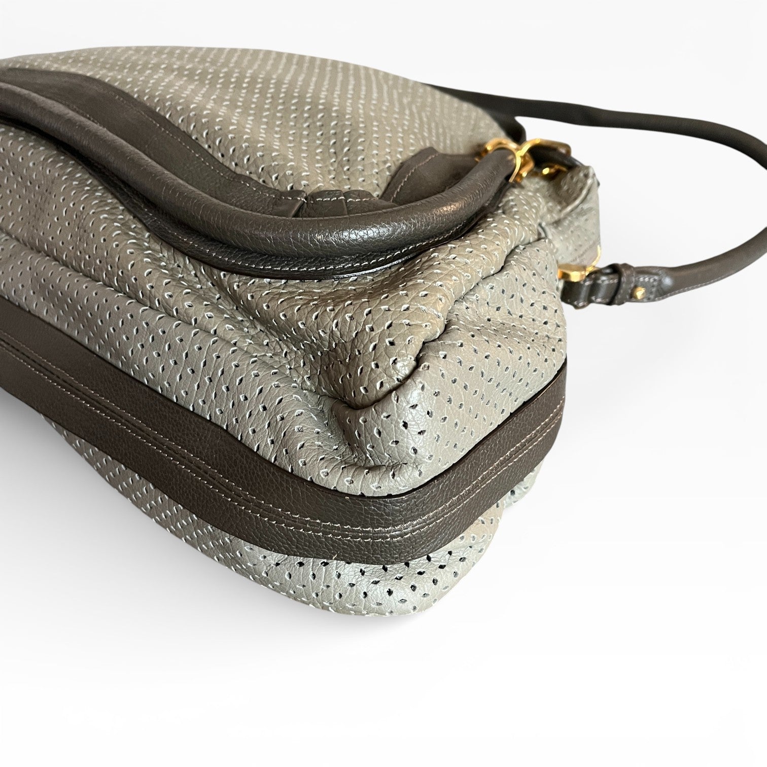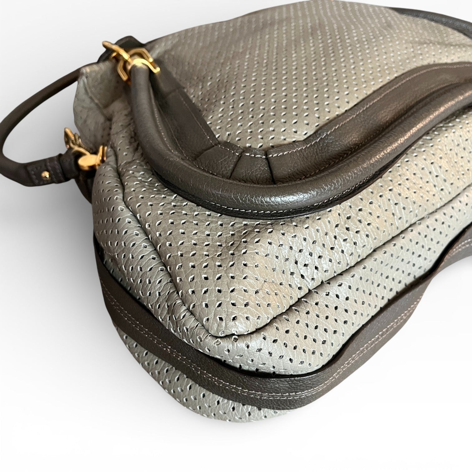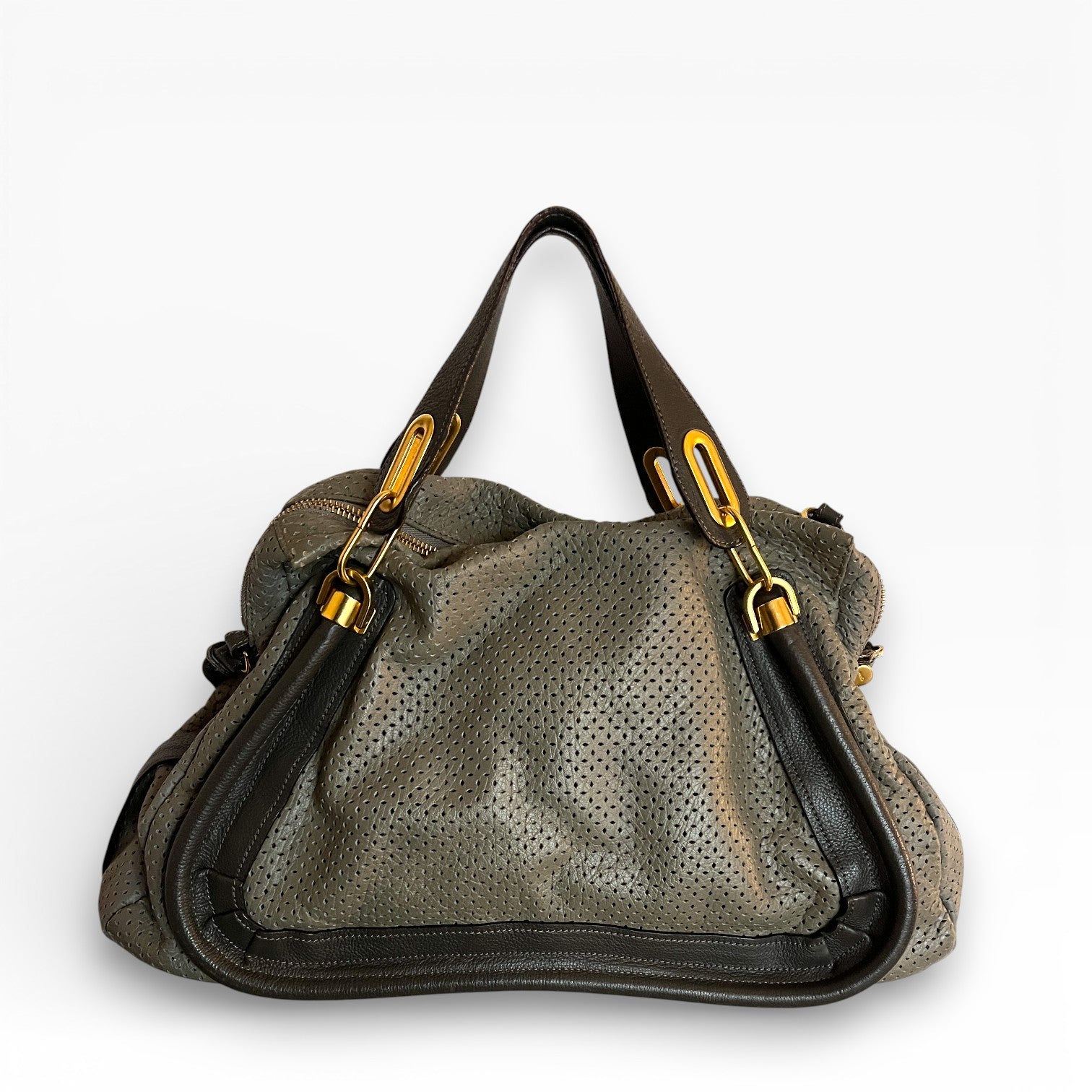 Chloé Paraty handbag in a rare grey perforated leather with dark leather trim and gold-tone hardware. Features top handles and a detachable shoulder strap. Classic structured shape with zip closure. Great everyday designer bag.