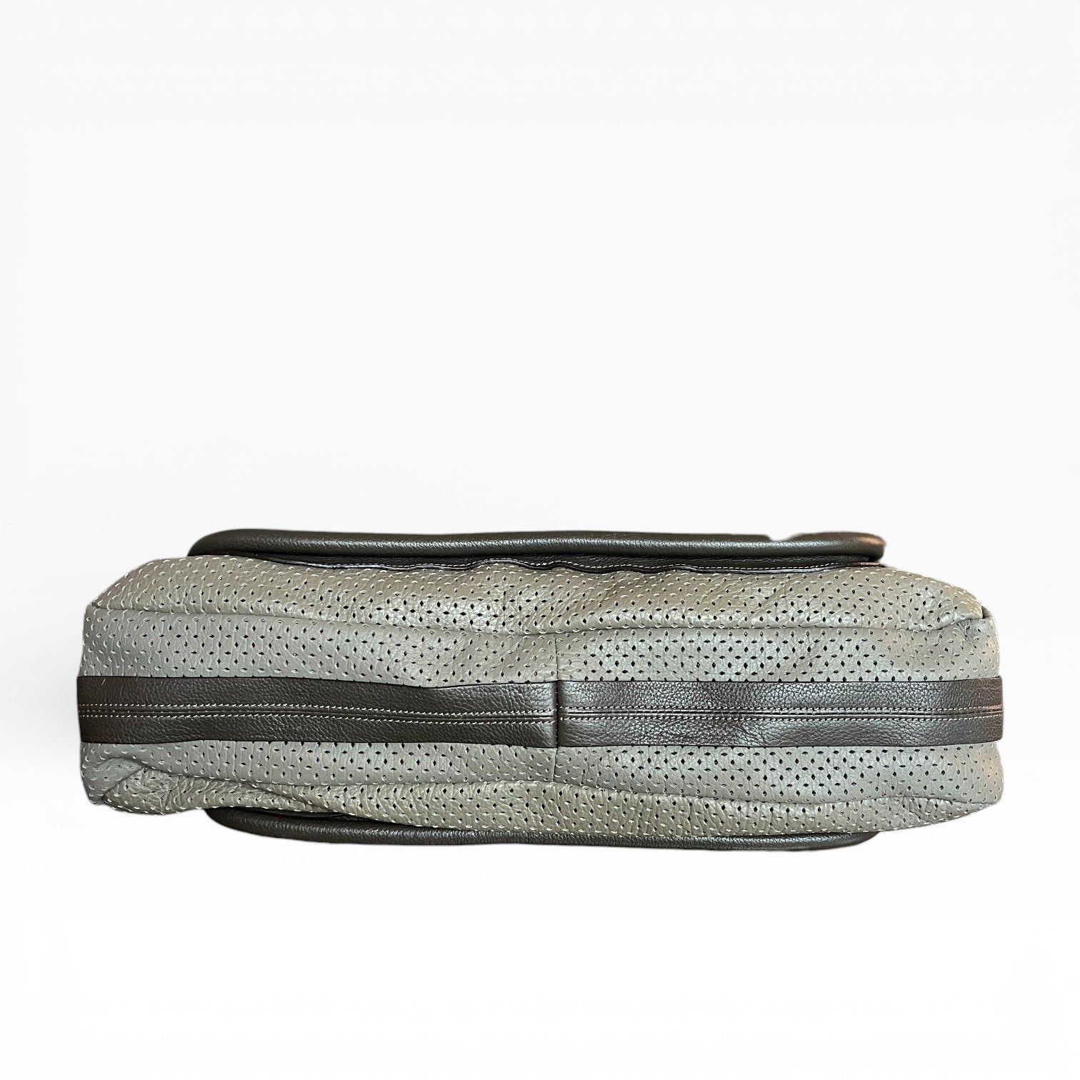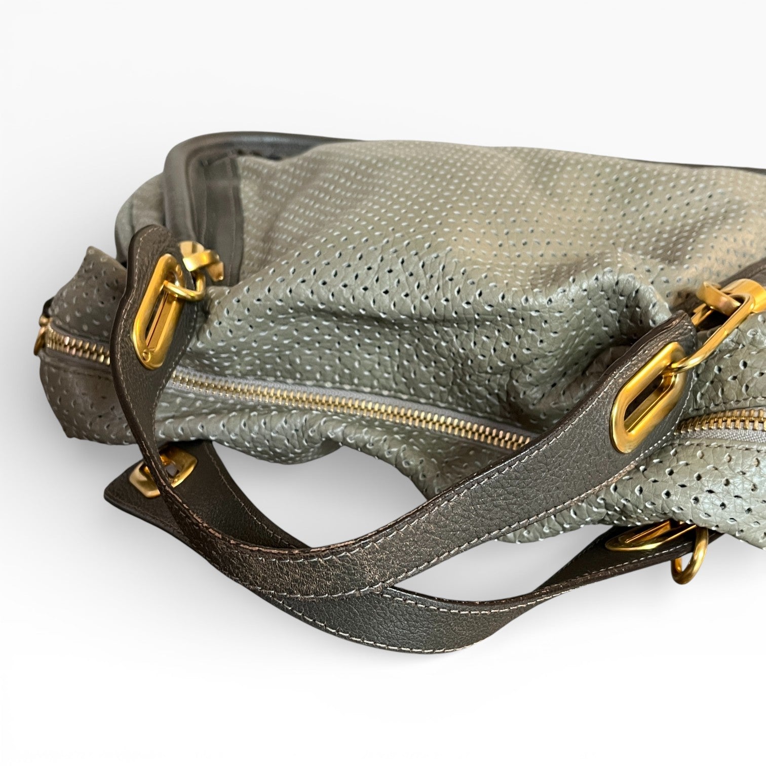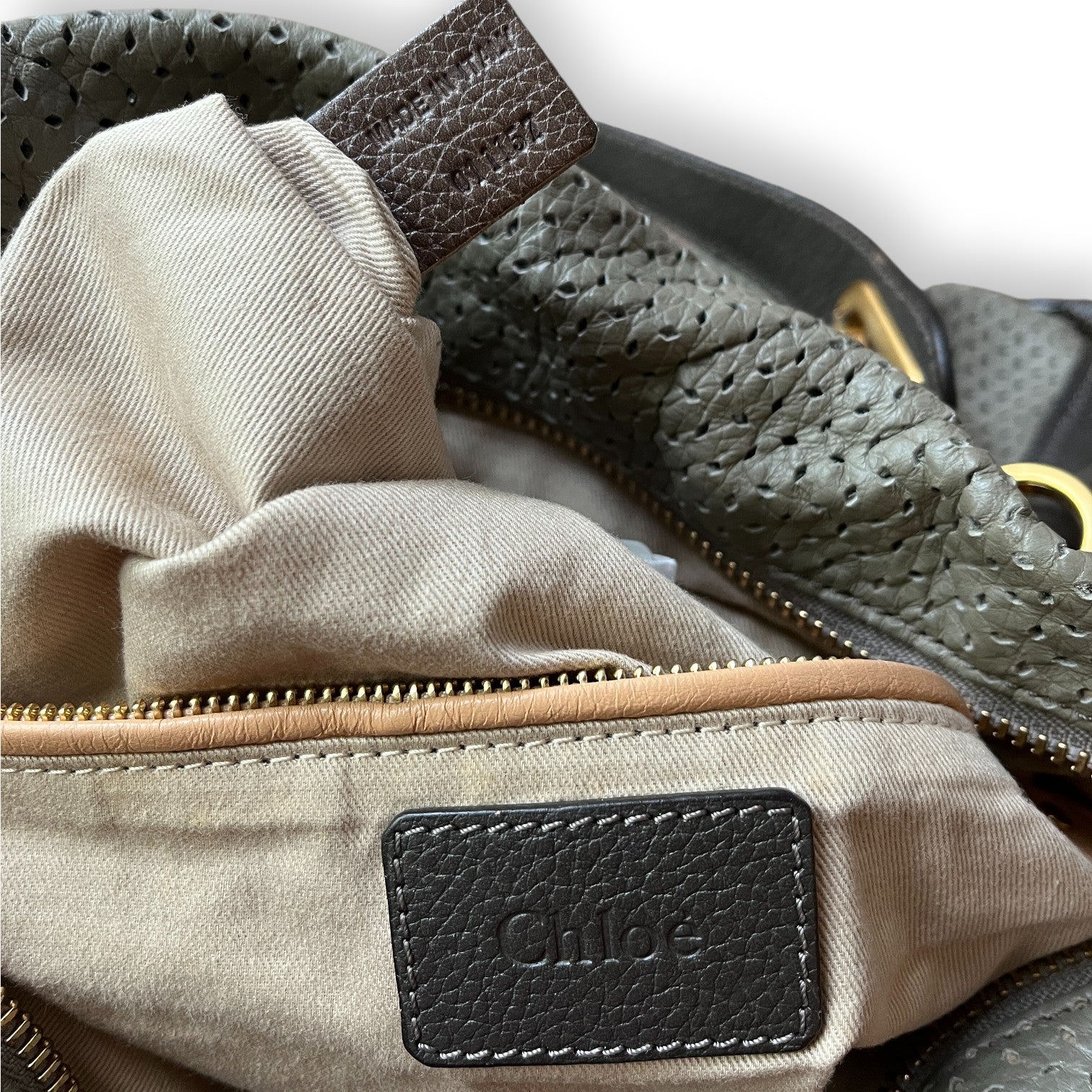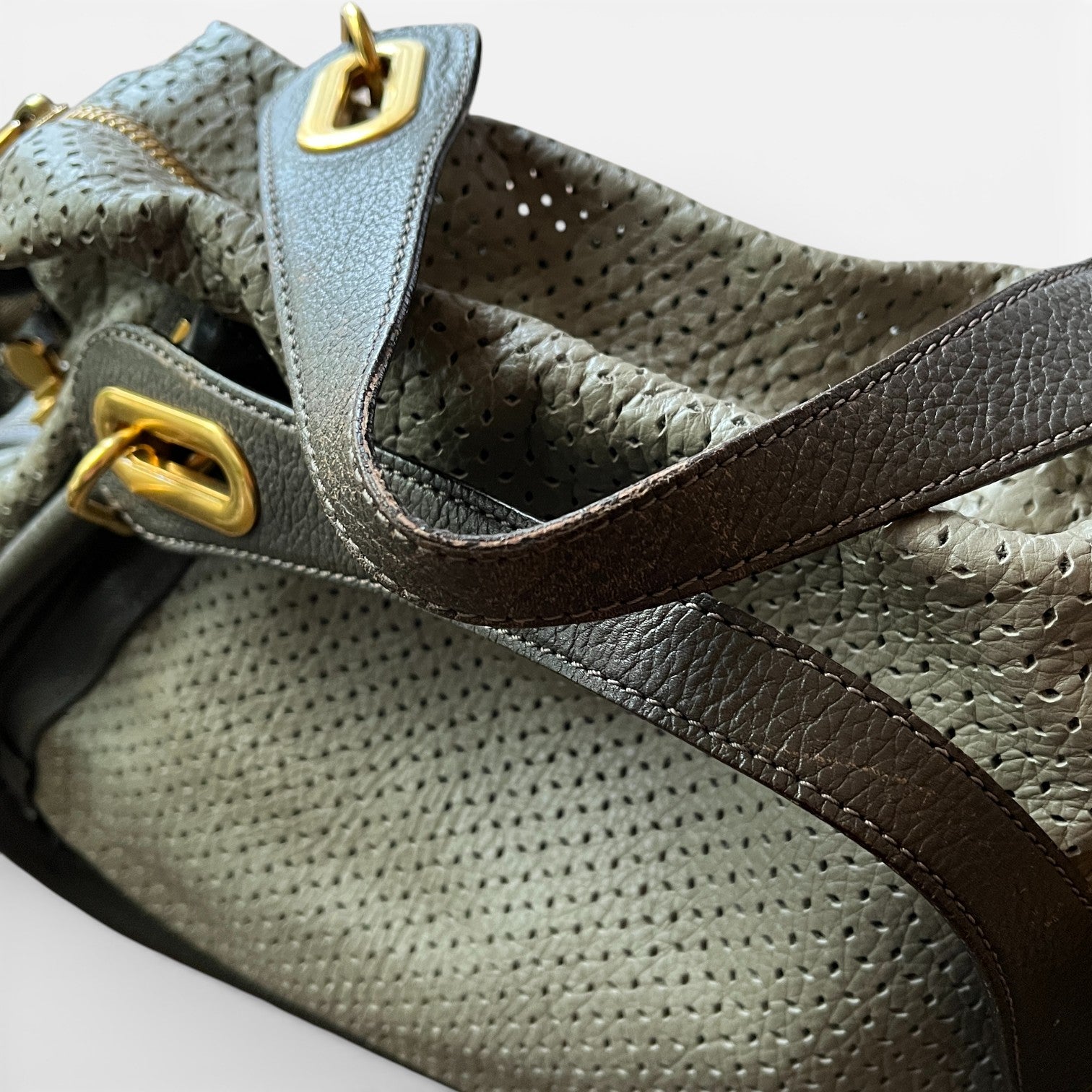 Chloé Paraty handbag in a rare grey perforated leather with dark leather trim and gold-tone hardware. Features top handles and a detachable shoulder strap. Classic structured shape with zip closure. Great everyday designer bag.