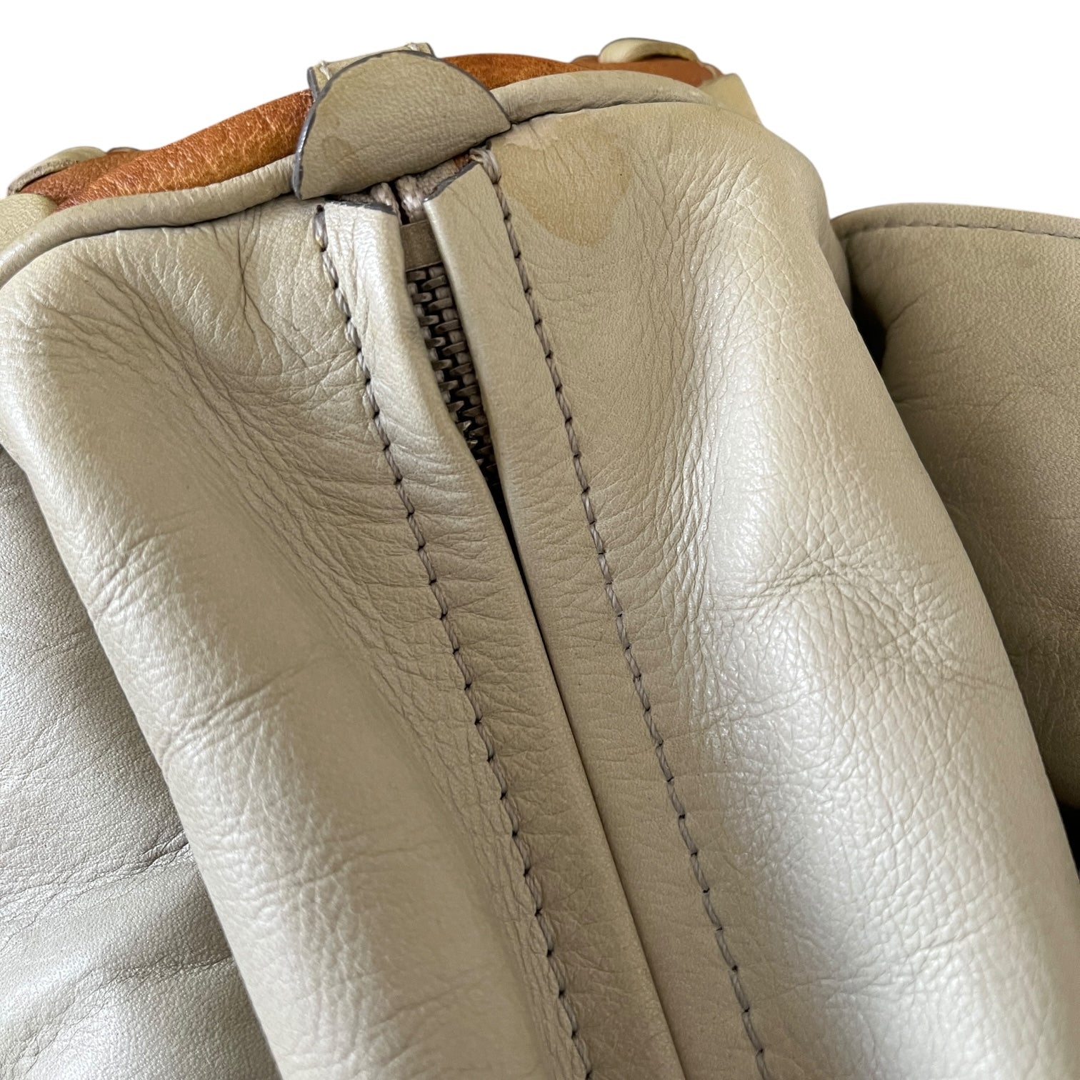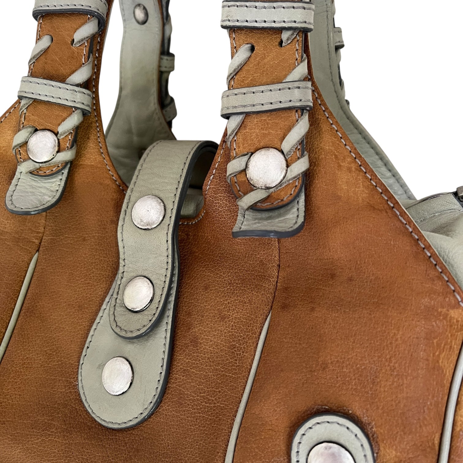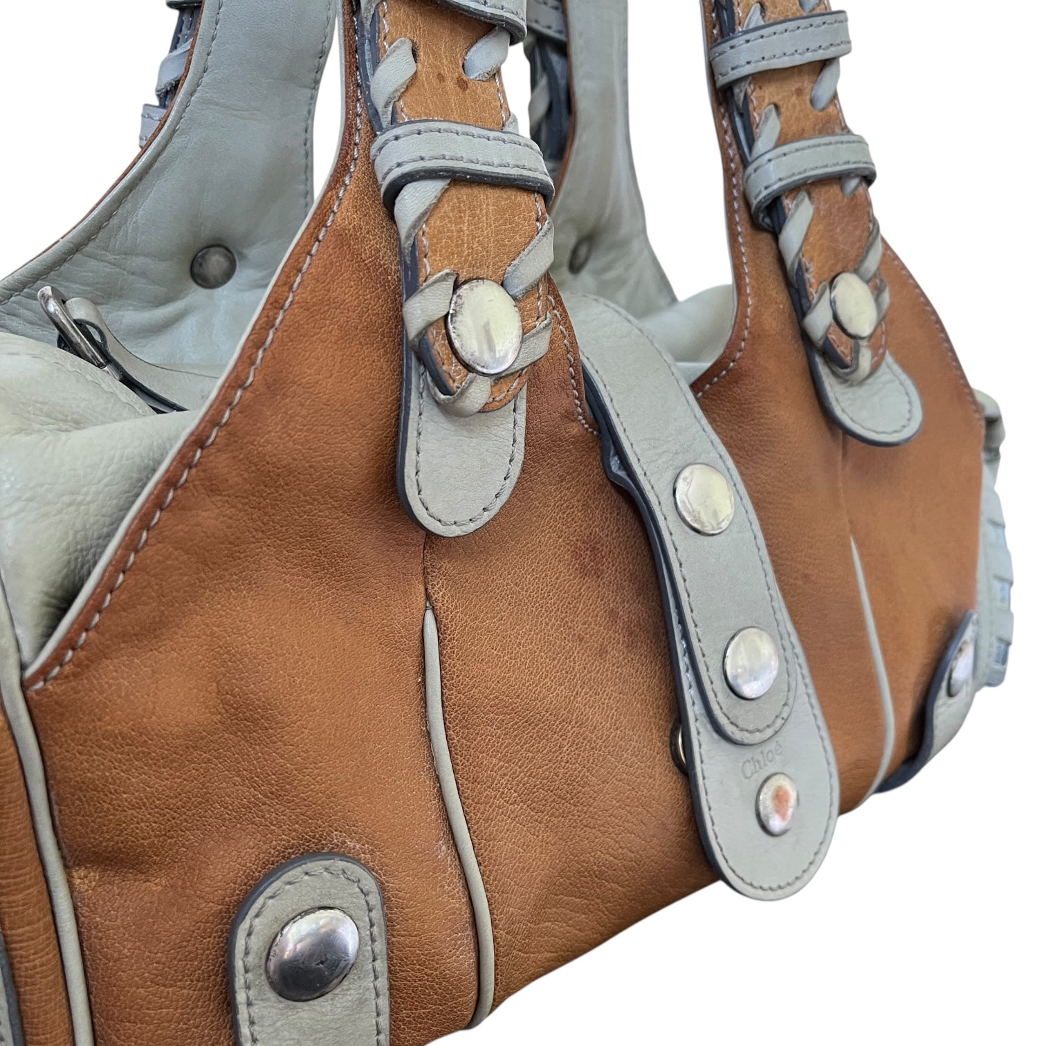 RARE 2000s Chloé Silverado Shoulder Bag, designed by Stella McCartney. Tan leather with dove grey (blue/grey) accents. Features two exterior pockets, two small side pockets, and two interior compartments inside the main section.