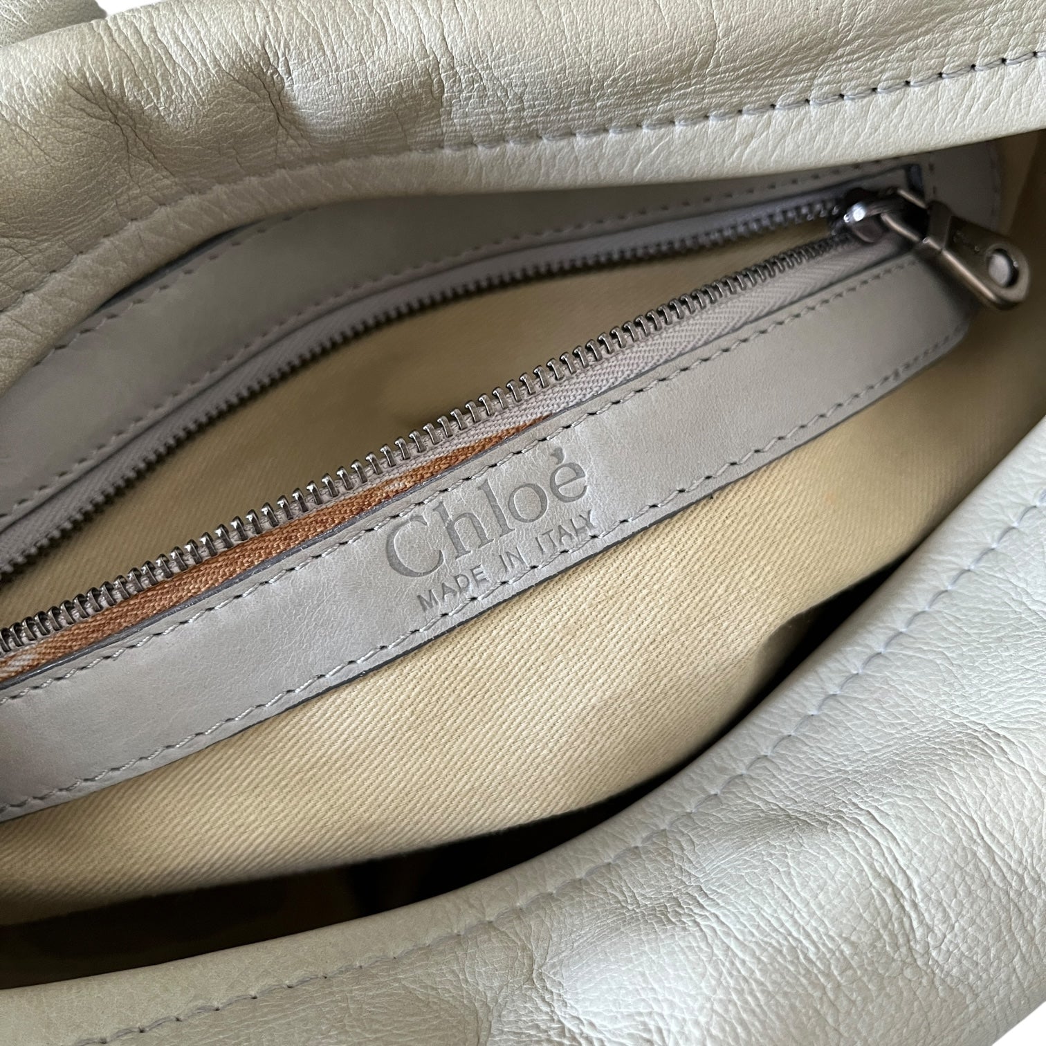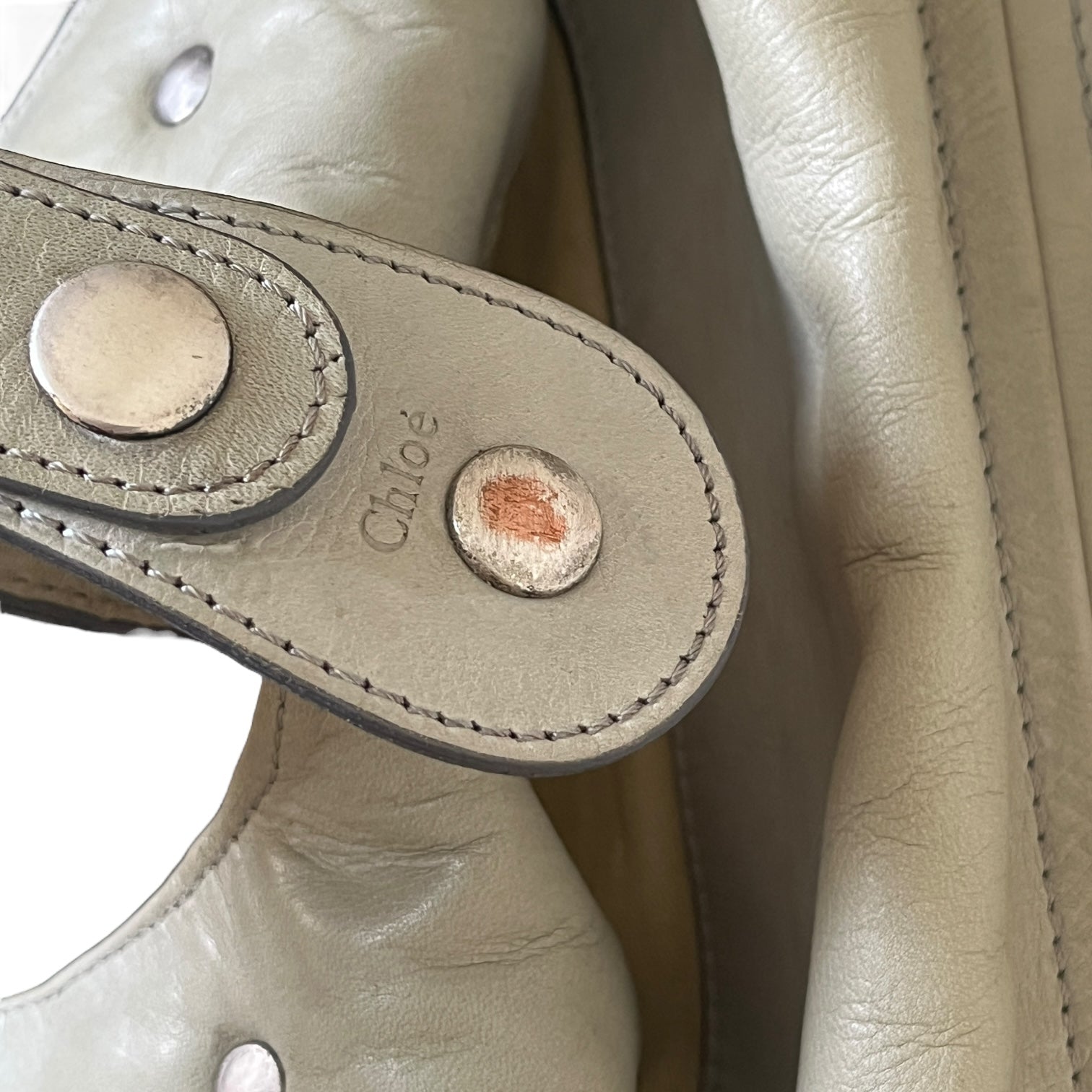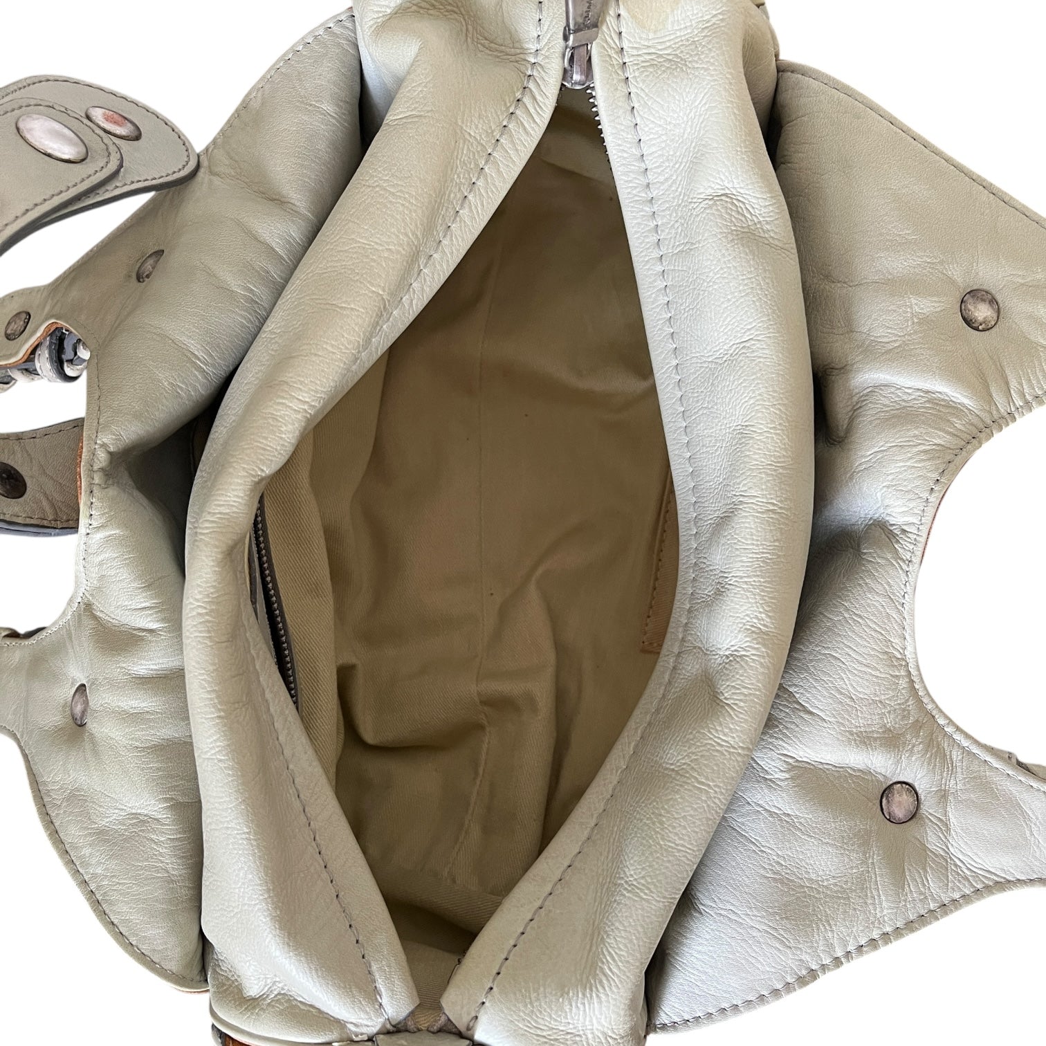 RARE 2000s Chloé Silverado Shoulder Bag, designed by Stella McCartney. Tan leather with dove grey (blue/grey) accents. Features two exterior pockets, two small side pockets, and two interior compartments inside the main section.