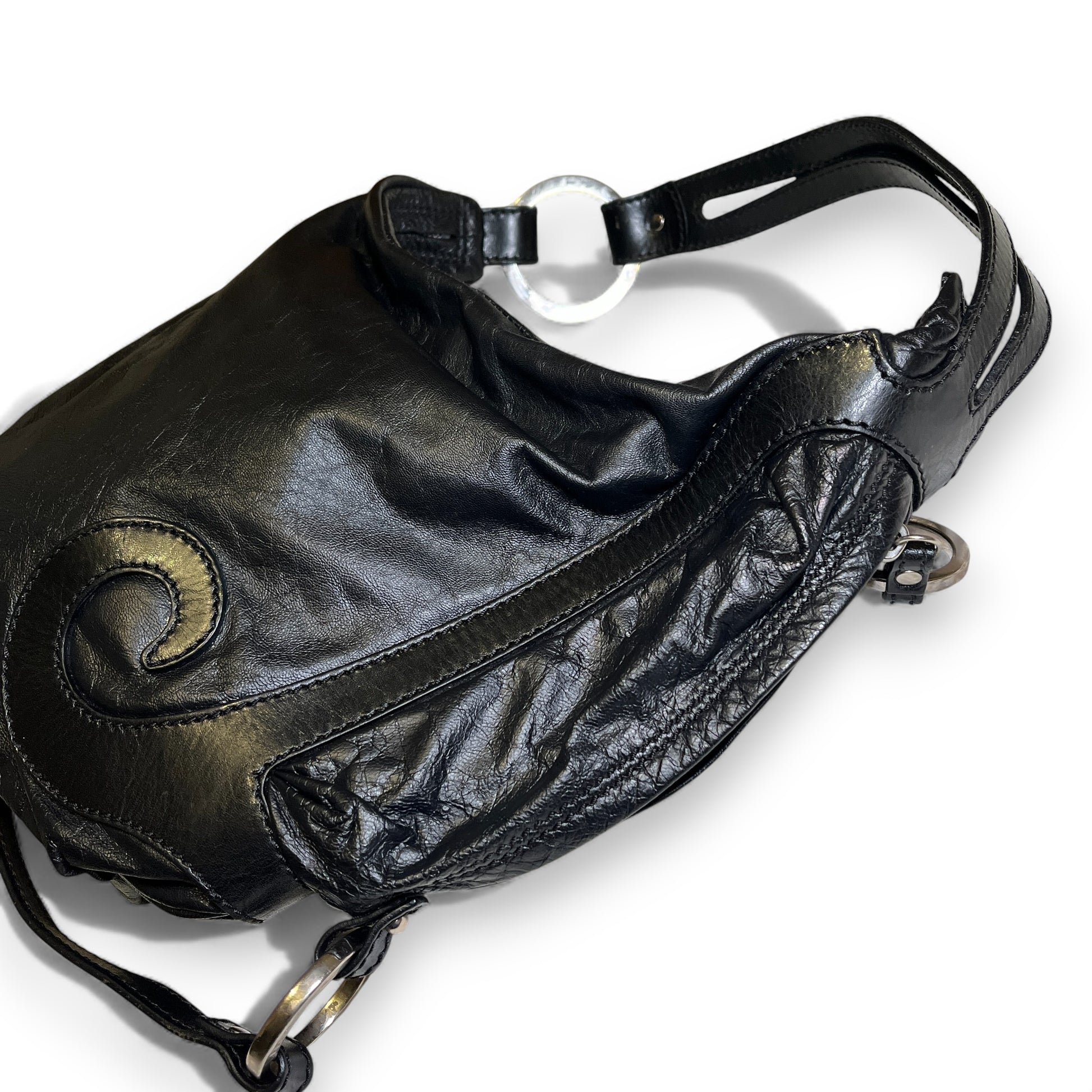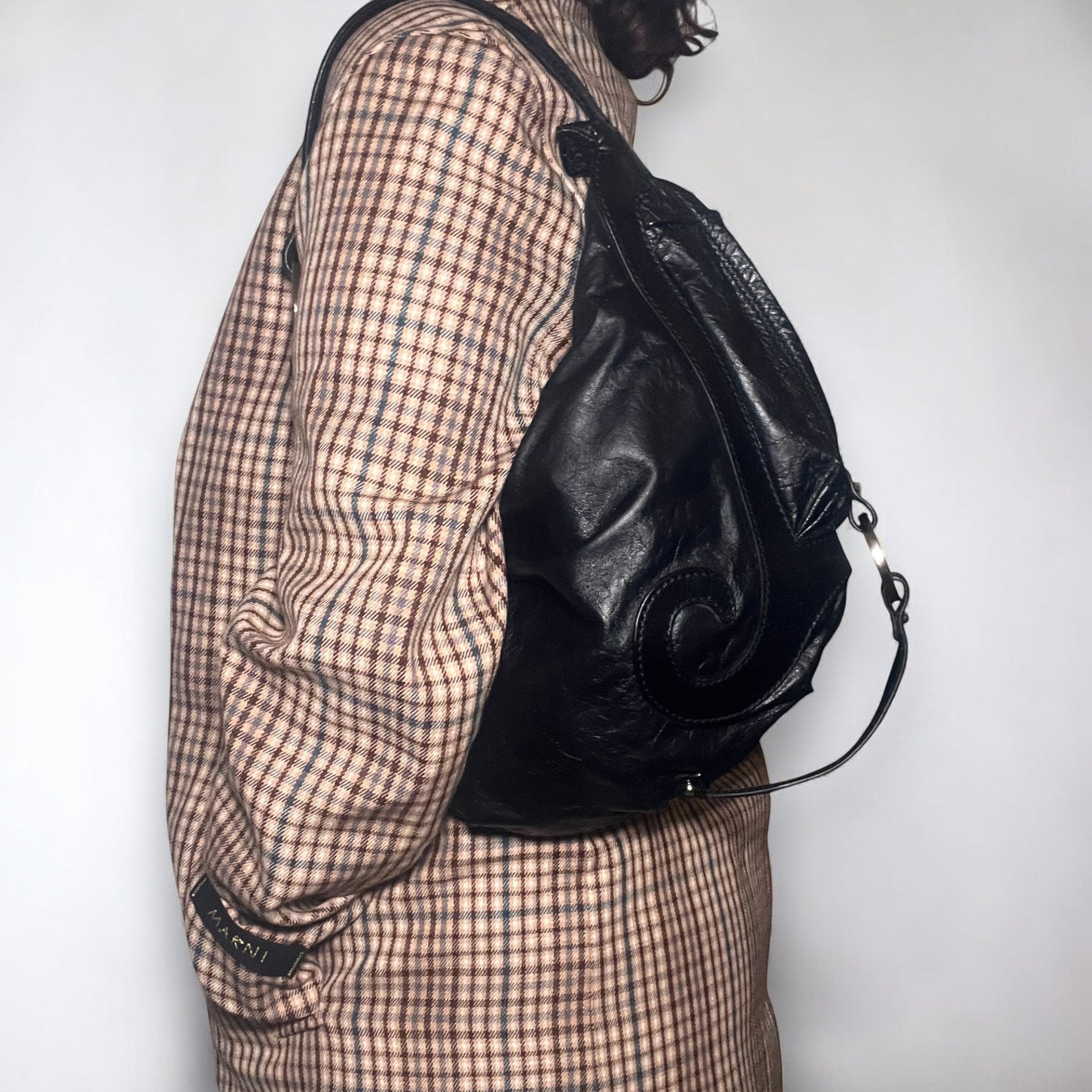Iconic Fendi Oyster hobo bag in black leather with silver hardware. Signature asymmetric form with the famous exterior side pocket.