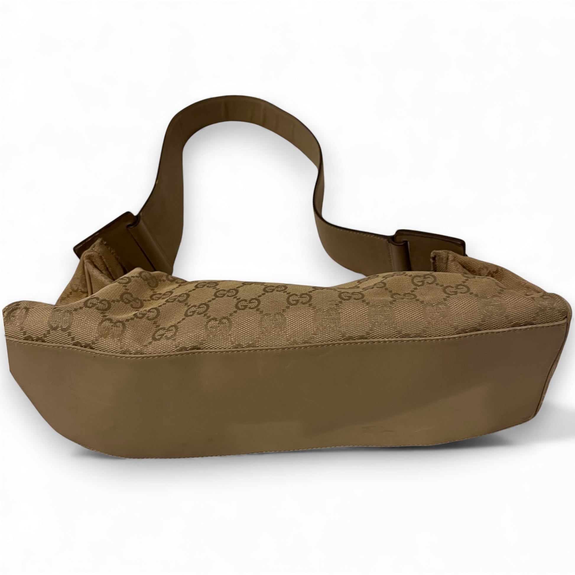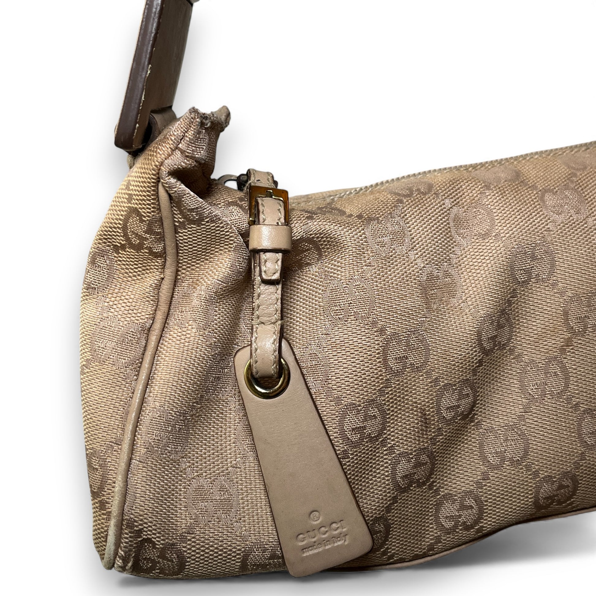 GG Canvas Pochette Bag. Beige canvas with single leather strap. Interior pocket, zipper closure, nylon lining.