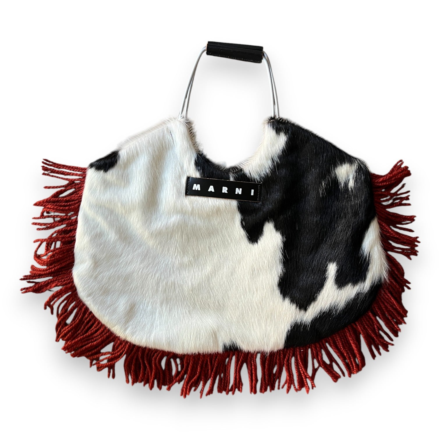 Super rare pony-hair MARNI masterpiece with red fringe detailing. Limited run from the Marni Market range. Signature metal double handles.