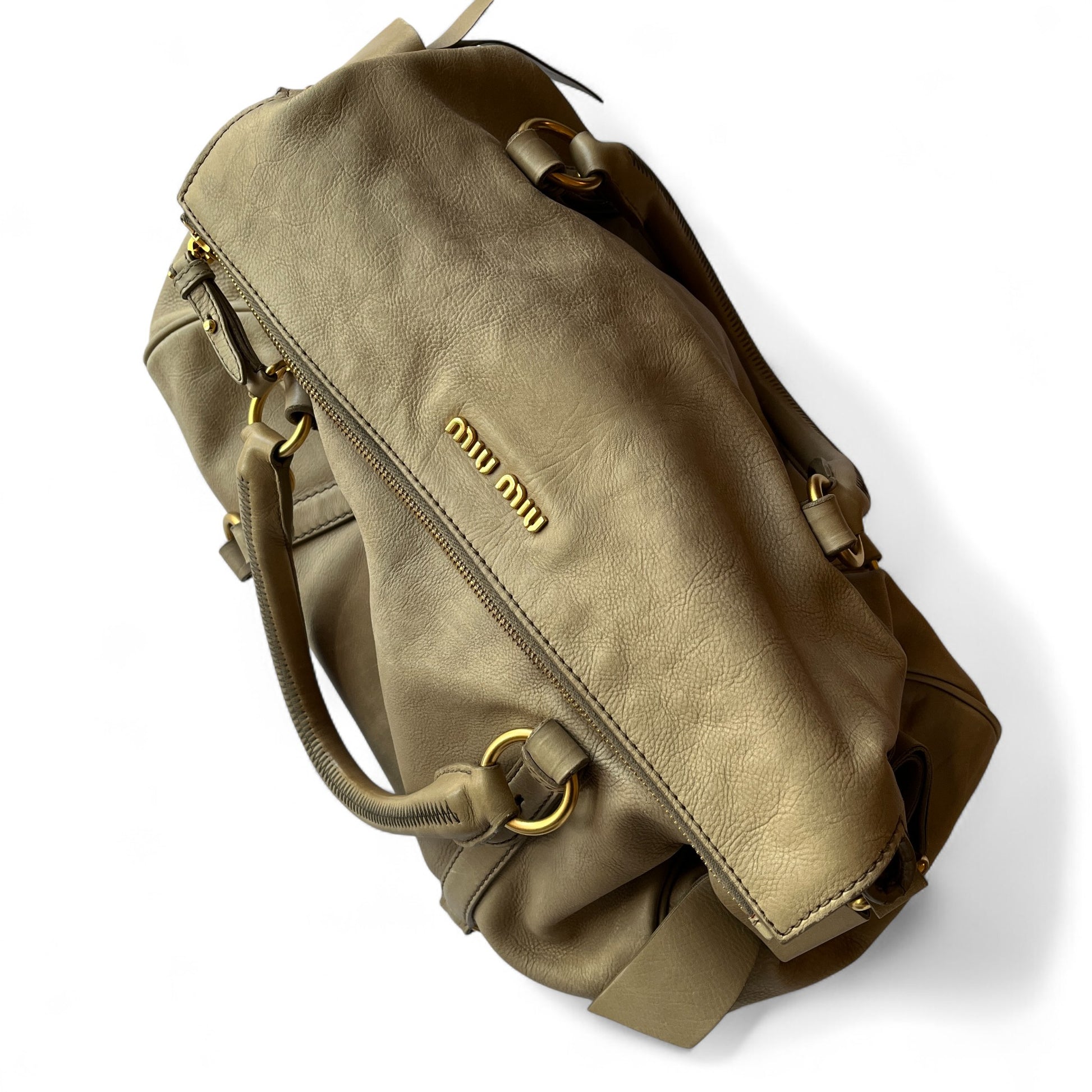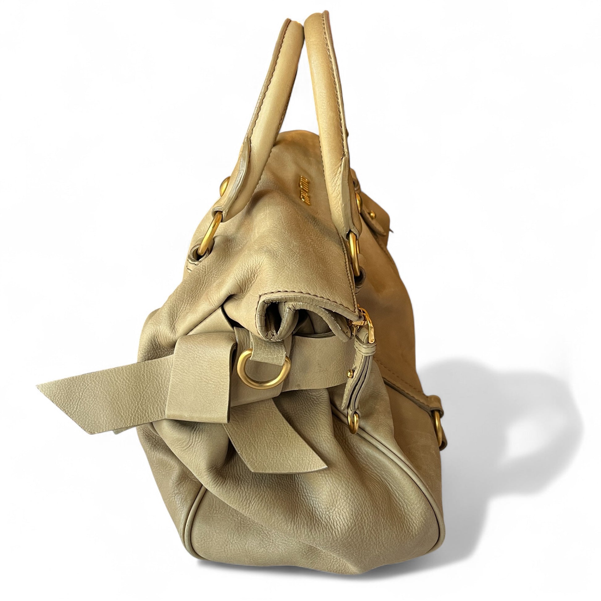 Crafted from exceptionally soft leather with a suede-like feel, this Miu Miu classic features signature bow details on each side. The colour sits between grey and beige, showing subtle sage undertones in certain light. Includes the original dust bag and detachable crossbody strap.