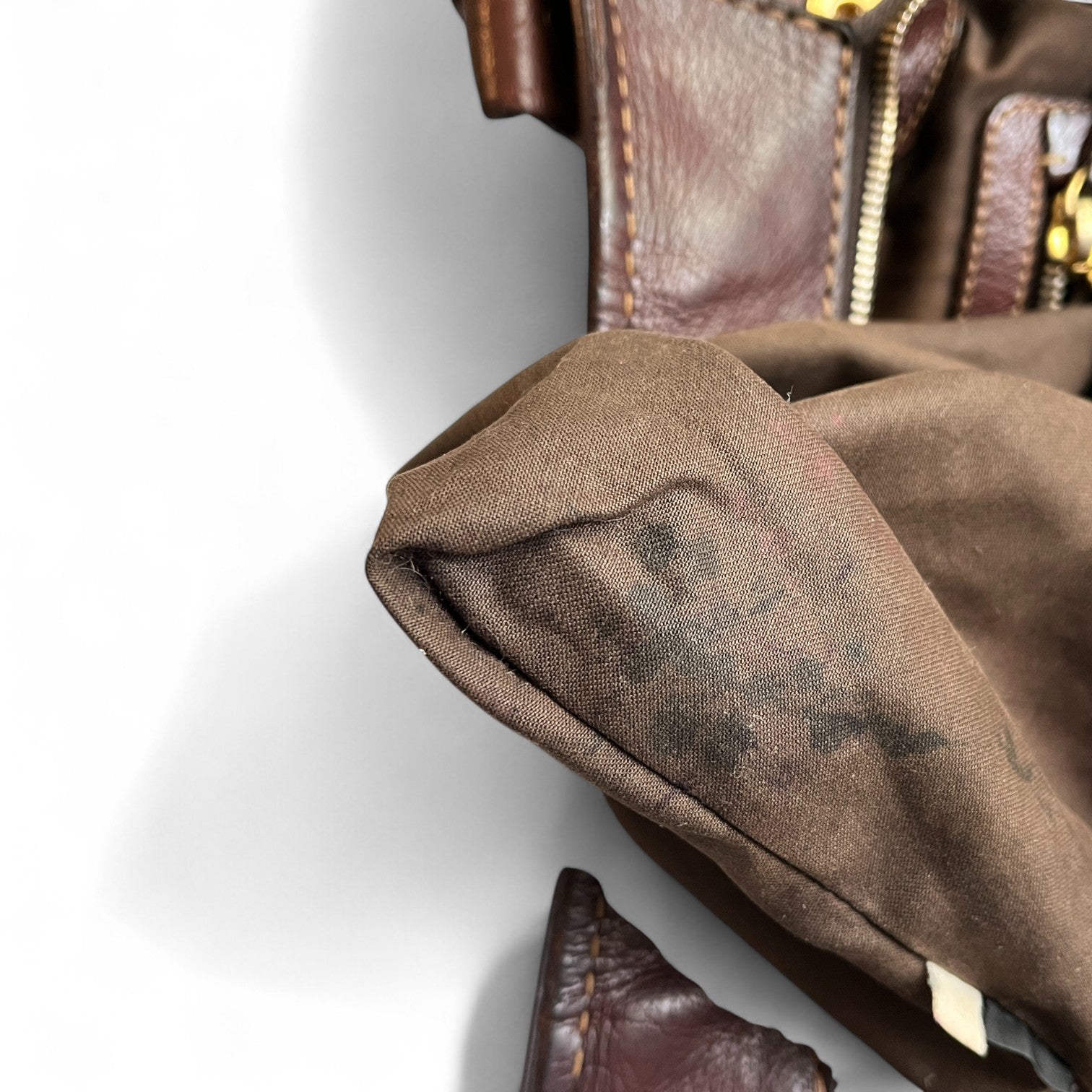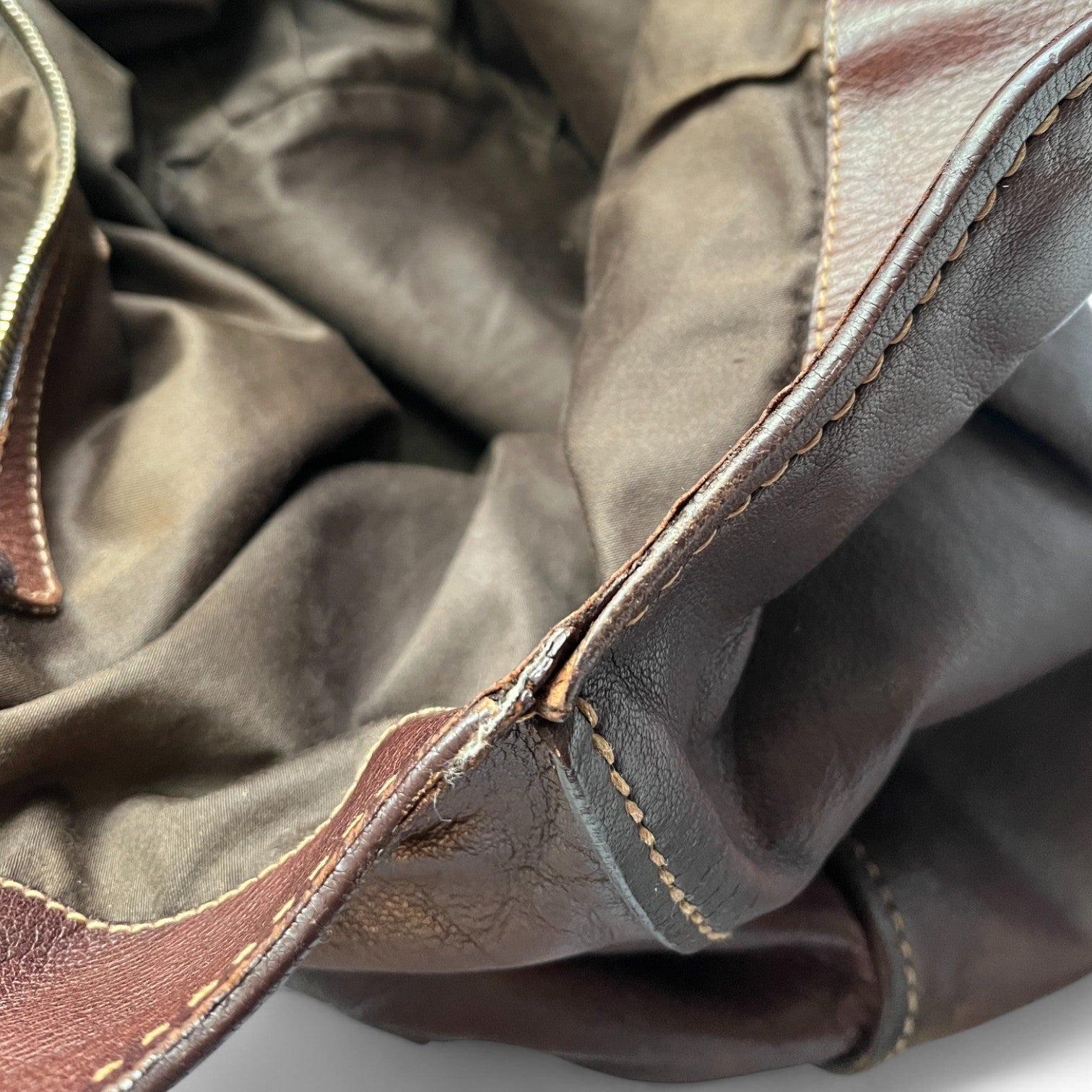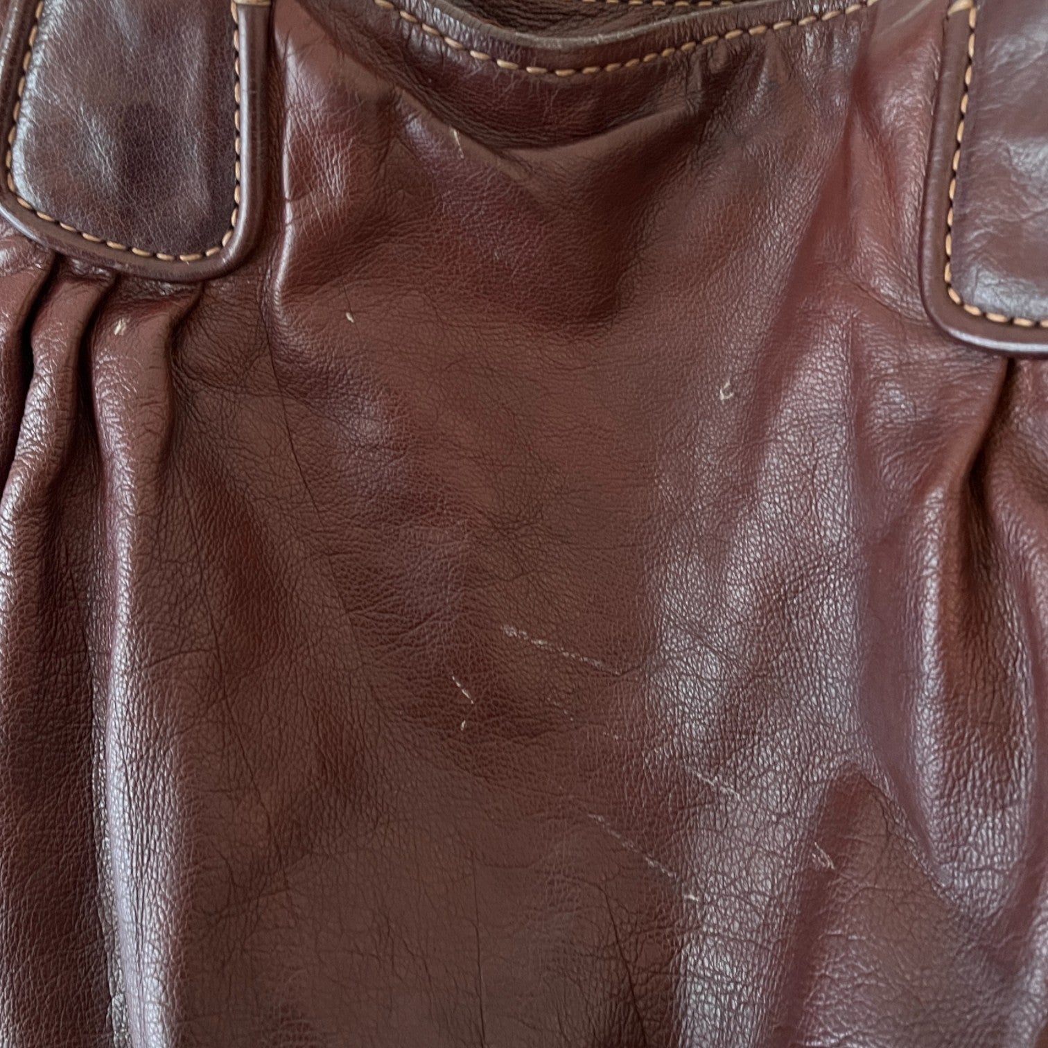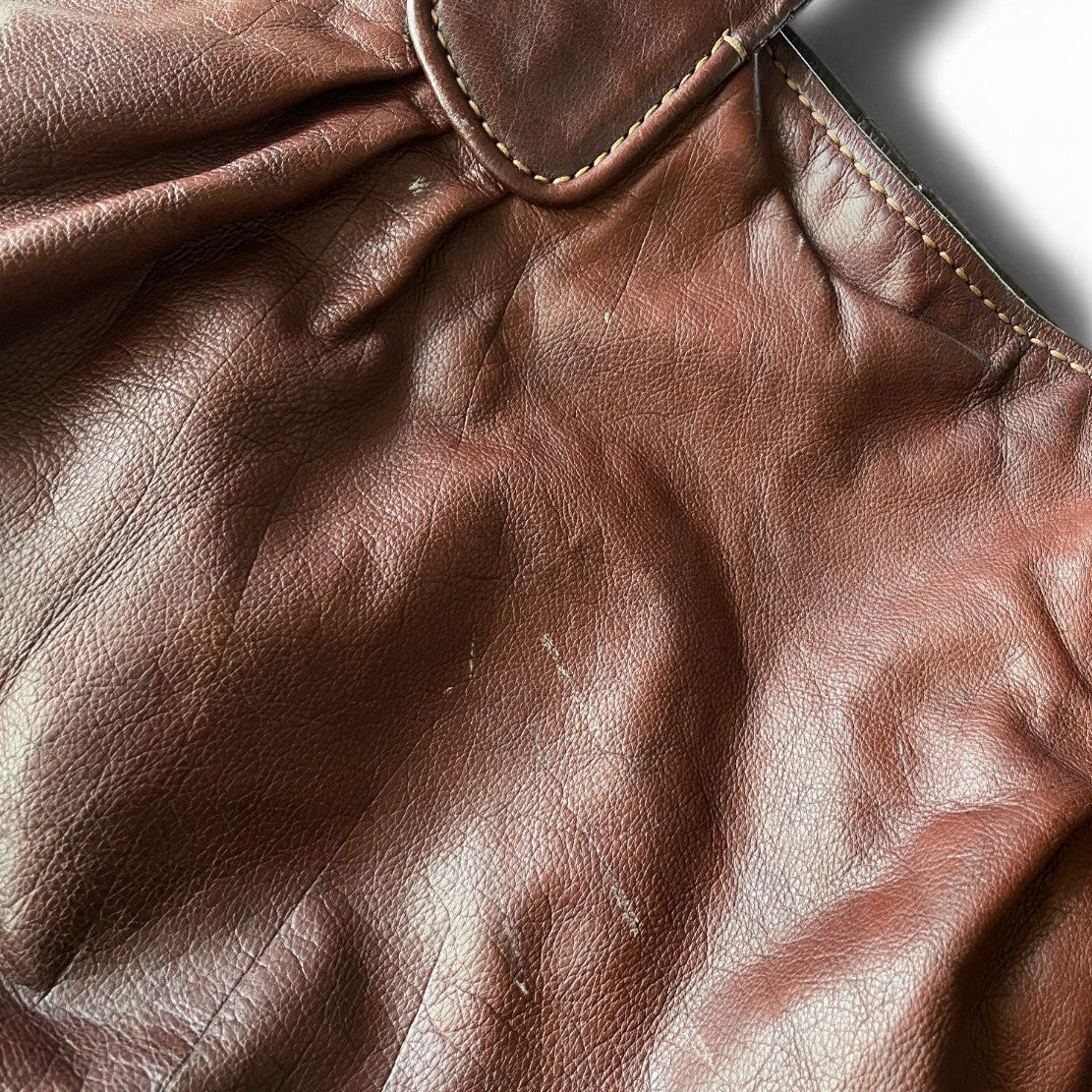 Condition: Gentle wear to the leather with minor surface scratches on the back and a missing thread near the zipper and a little loose leather has been sealed (does not affect functionality - photos detail this). Slight separation to the leather trim along the top/opening. The bag has been cleansed and conditioned.
