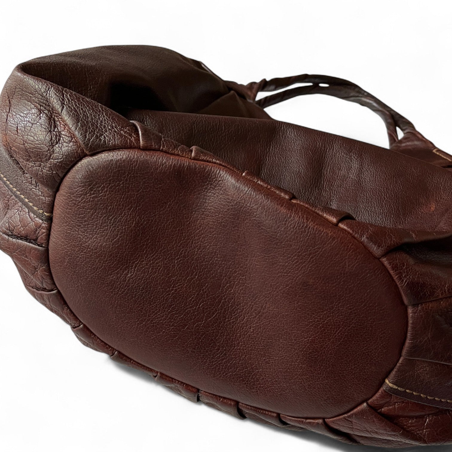 Rich brown distressed leather oversized Miu Miu tote featuring double twist-detail handles and a top zip closure.