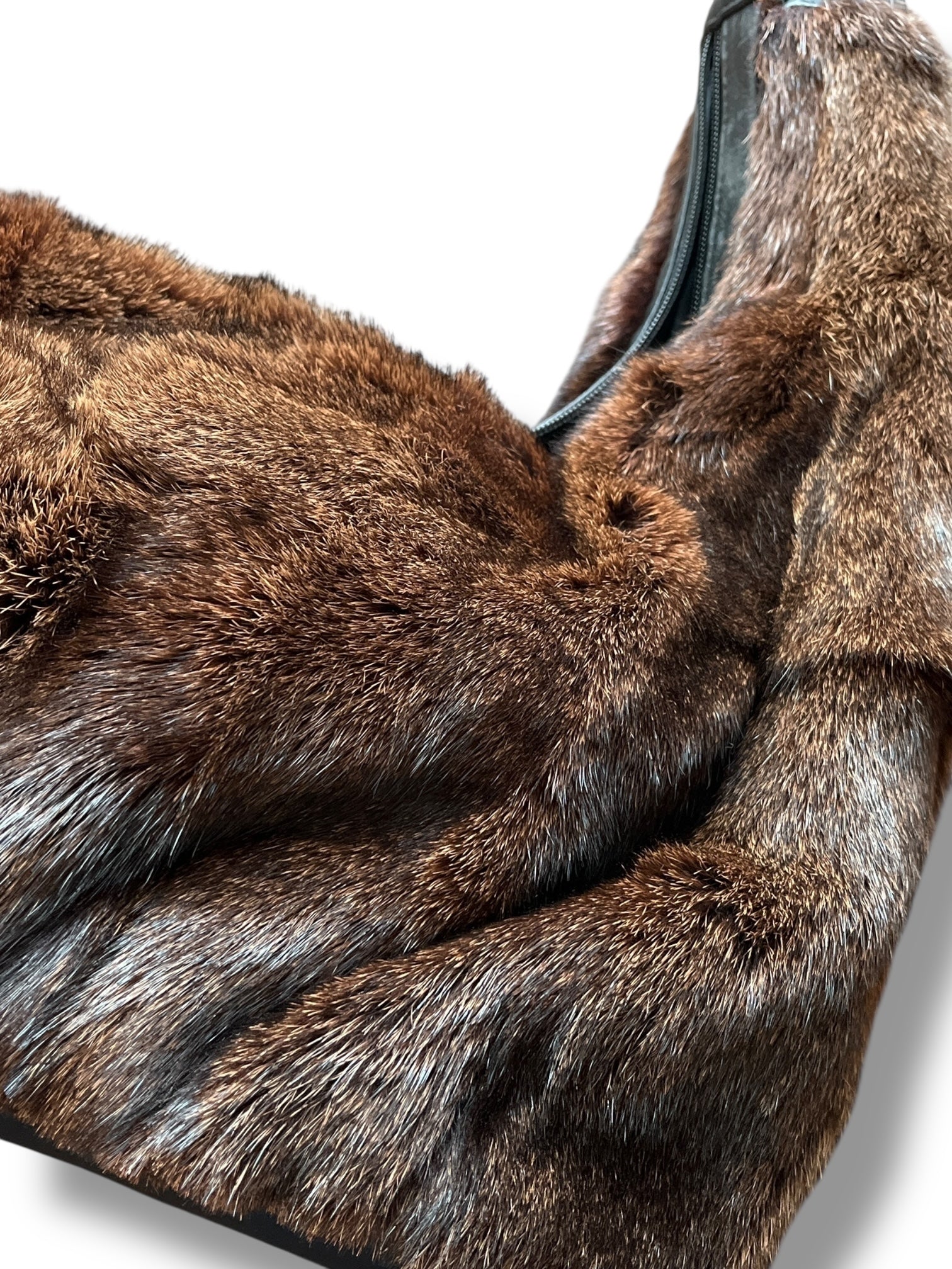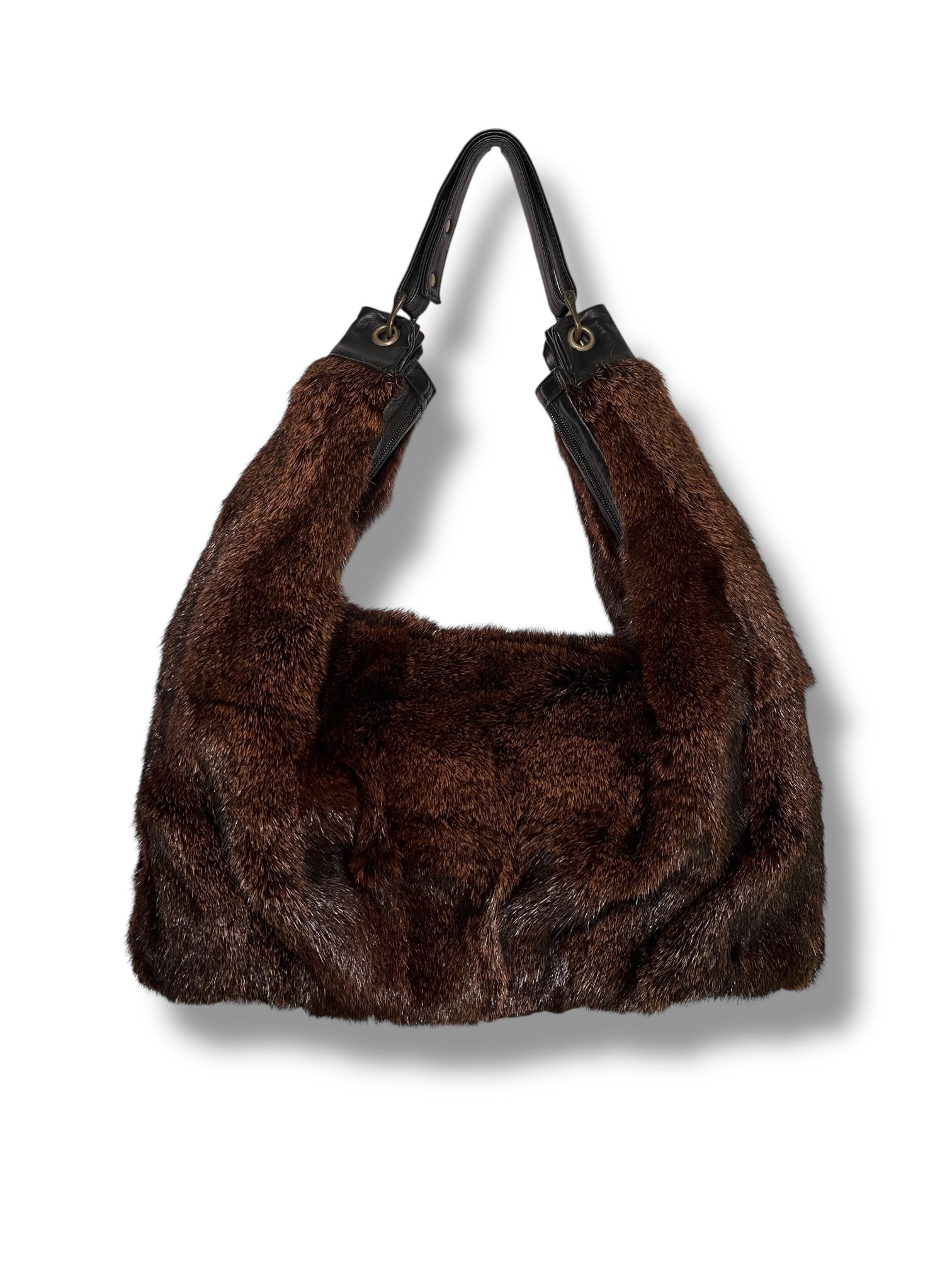 Real fur shoulder bag, believed to be mink. Features a slouchy silhouette in rich brown with subtle grey undertones and a smooth black leather strap.